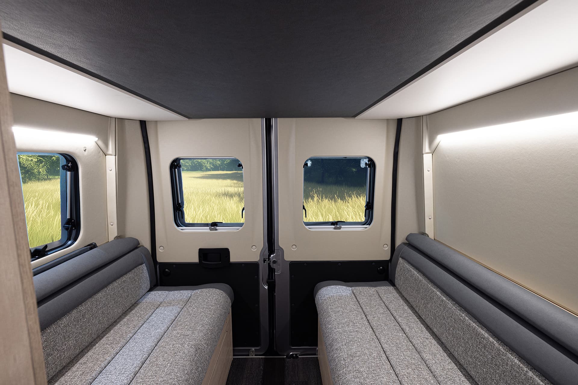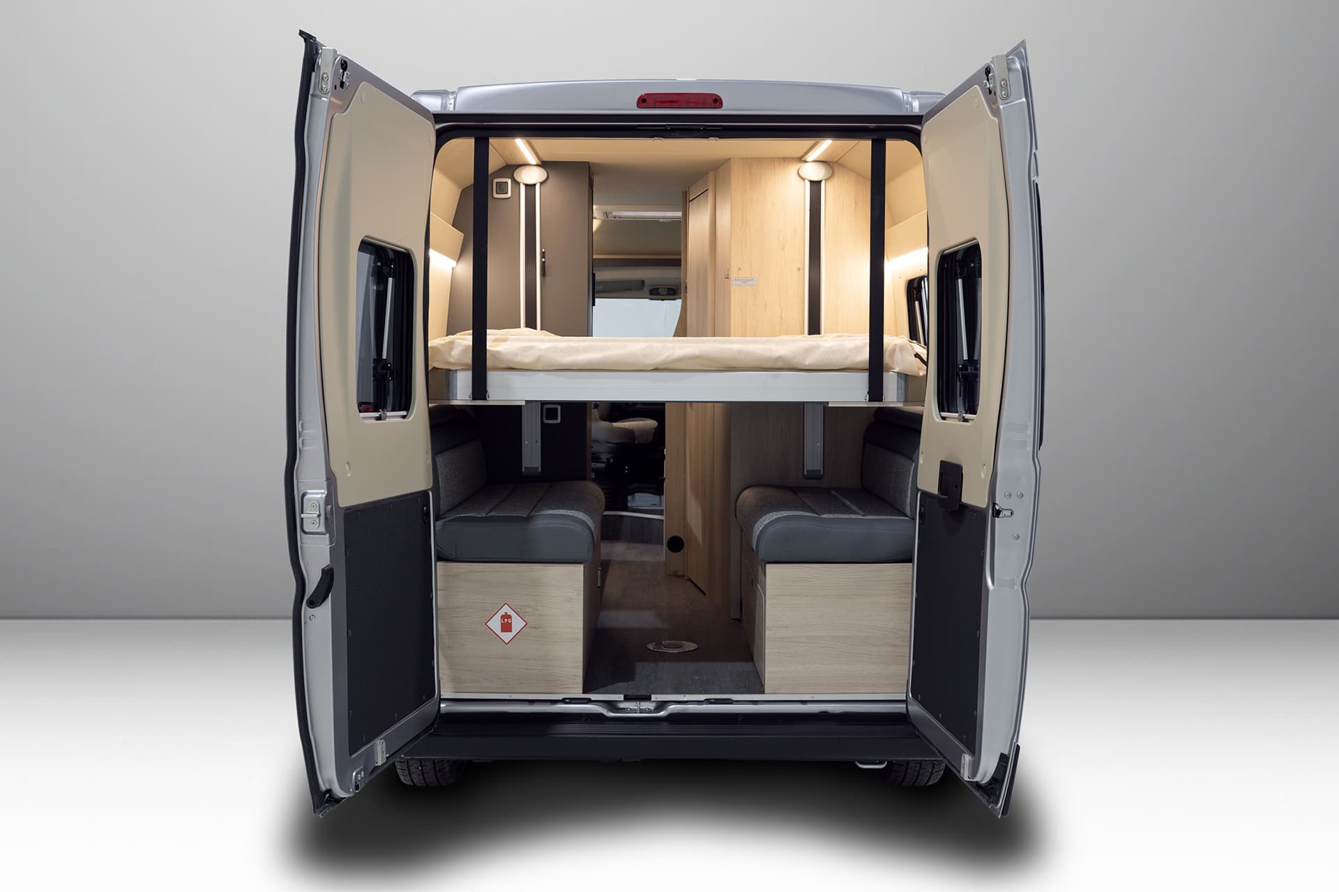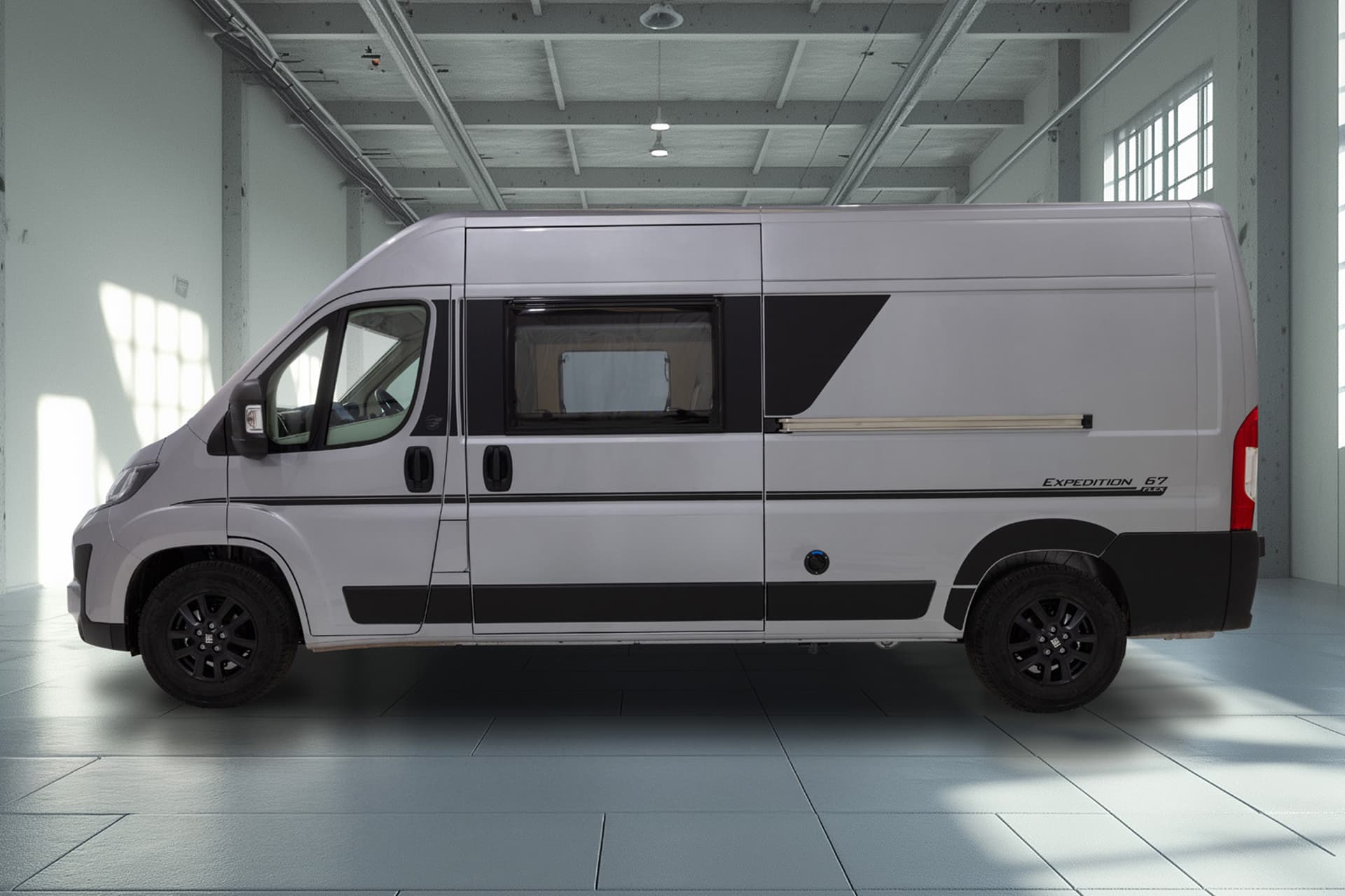 The Expedition 67 Flex is a fresh and popular campervan, containing many luxury features into a clever, easy to use design. Its defining characteristic is the rear double bed, which gives this camper its “flex” name due to its drop-down nature. During the day, this bed can be neatly tucked into the ceiling, revealing a comfy rear lounge with plenty of space to relax in.