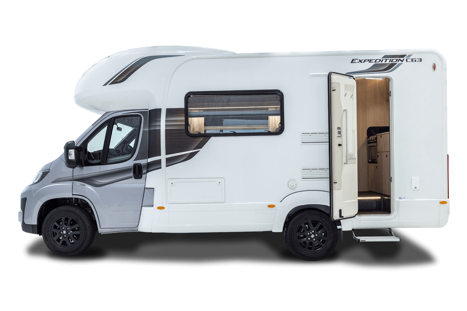 Despite being the shortest of Auto-Trail’s coachbuilt expedition range, the C63 has a wealth of living space that can easily accommodate families and groups. The main seating area is large and comfortable, stretching from the front to the middle of the interior. This section can also be transformed into a large double bed, which, when combined with the other bed in the over-cab, allows for up to four passengers to sleep soundly.