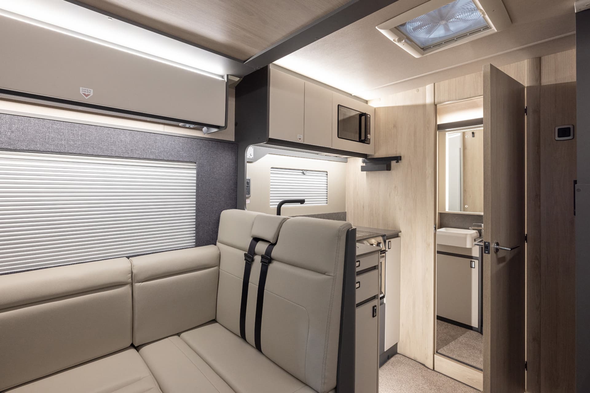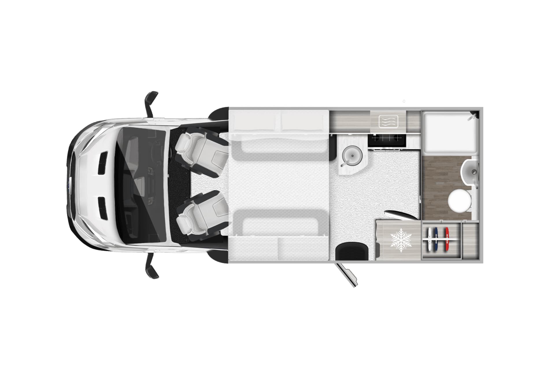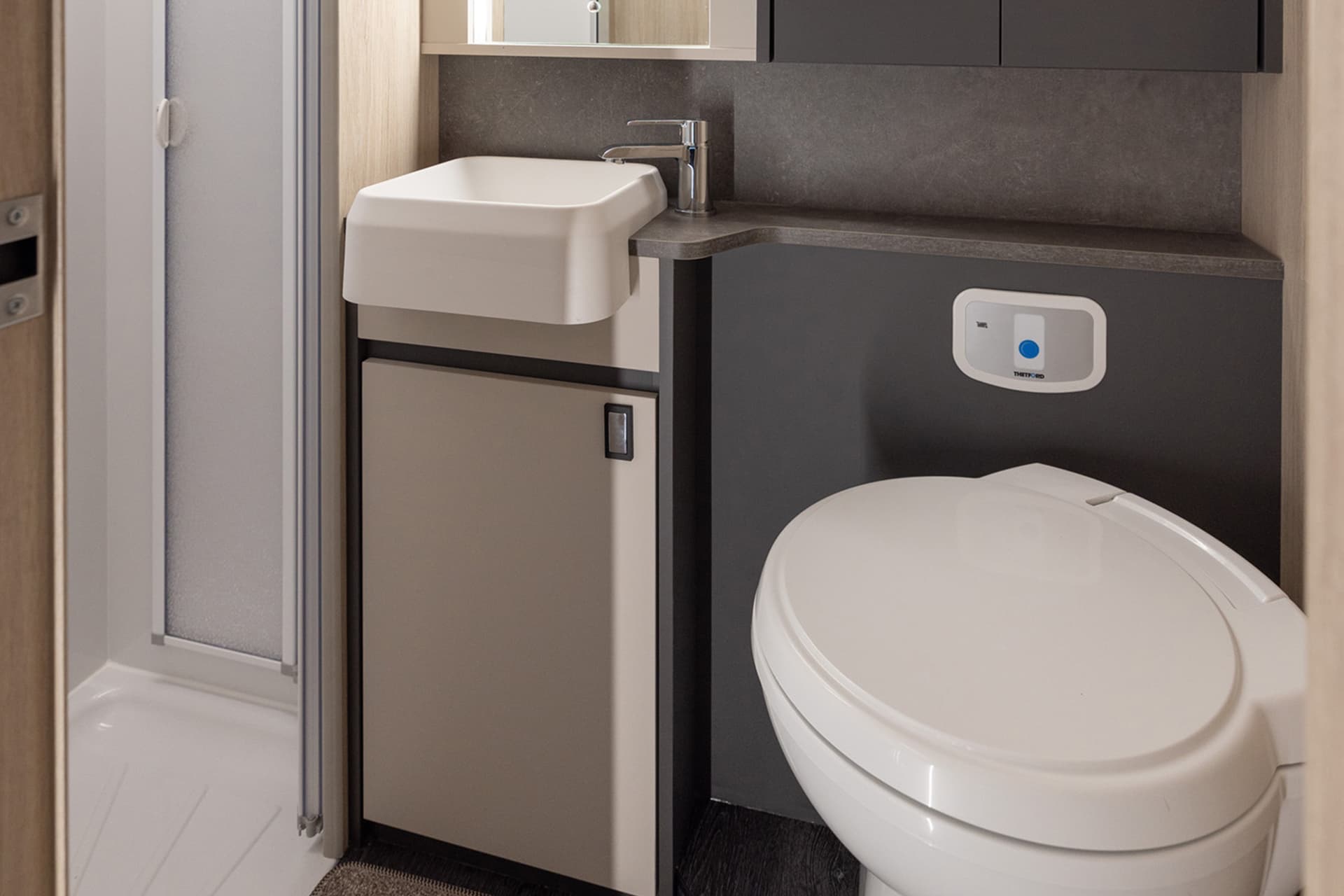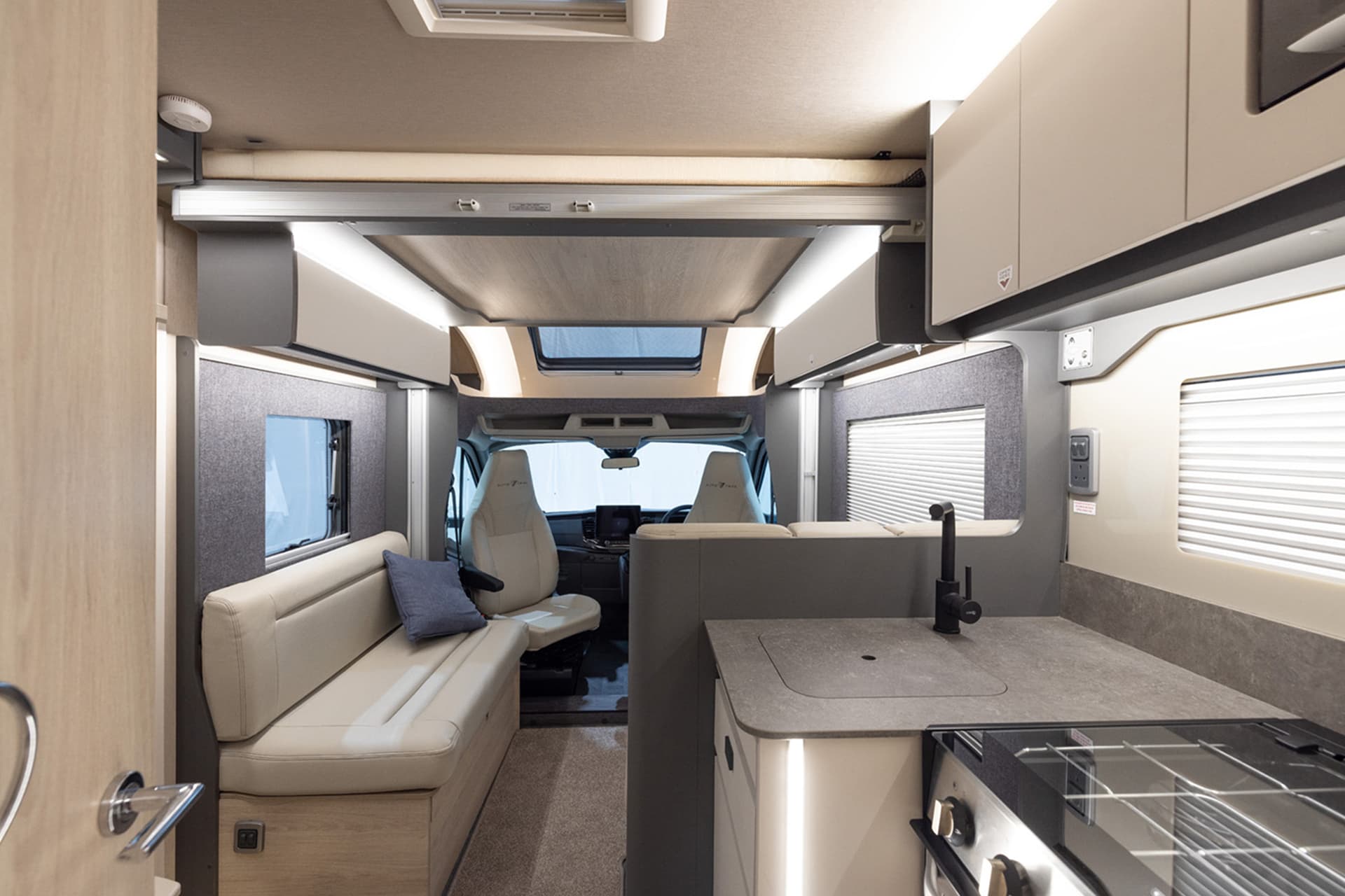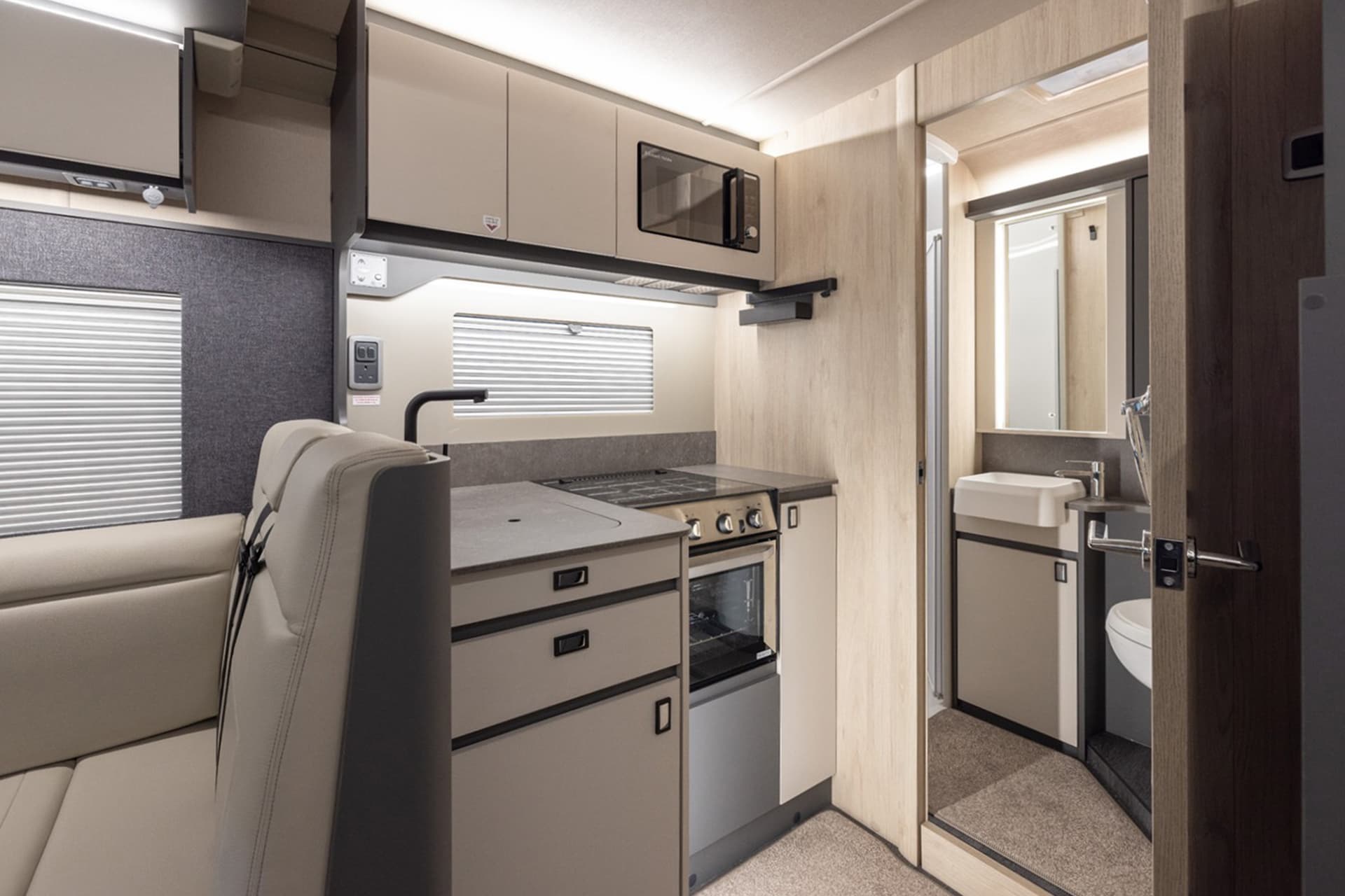 The kitchenette and bathroom have no compromise on space compared to the larger motorhomes, with the F60 featuring a large, easy to access rear washroom that has plenty of its own storage areas. There’s also the option to add a drop-down double bed over the dinette, which cleverly brings this motorhome up to a 4 berth without losing any interior space.