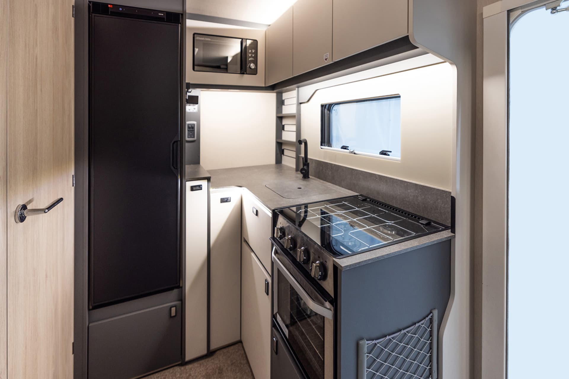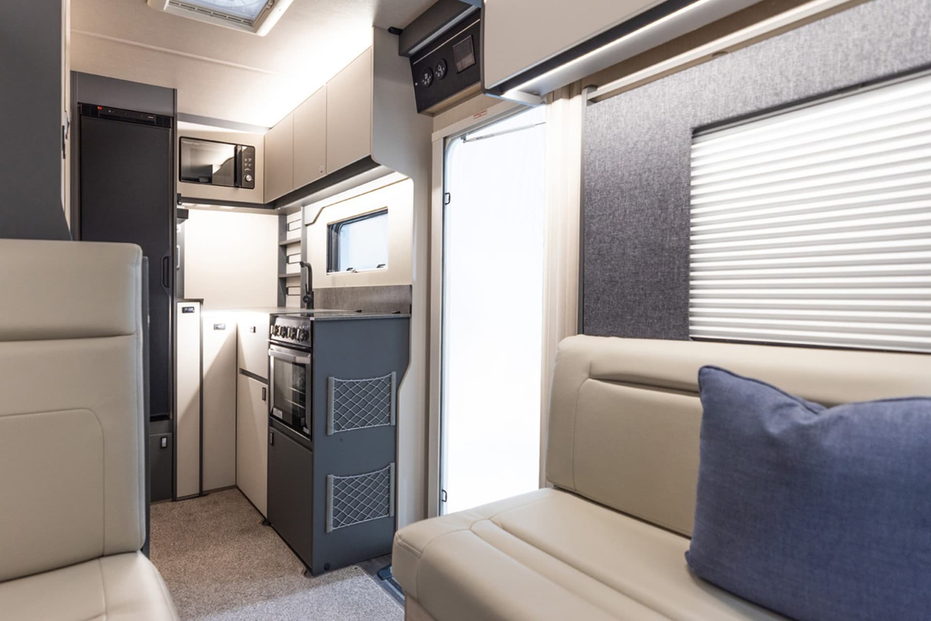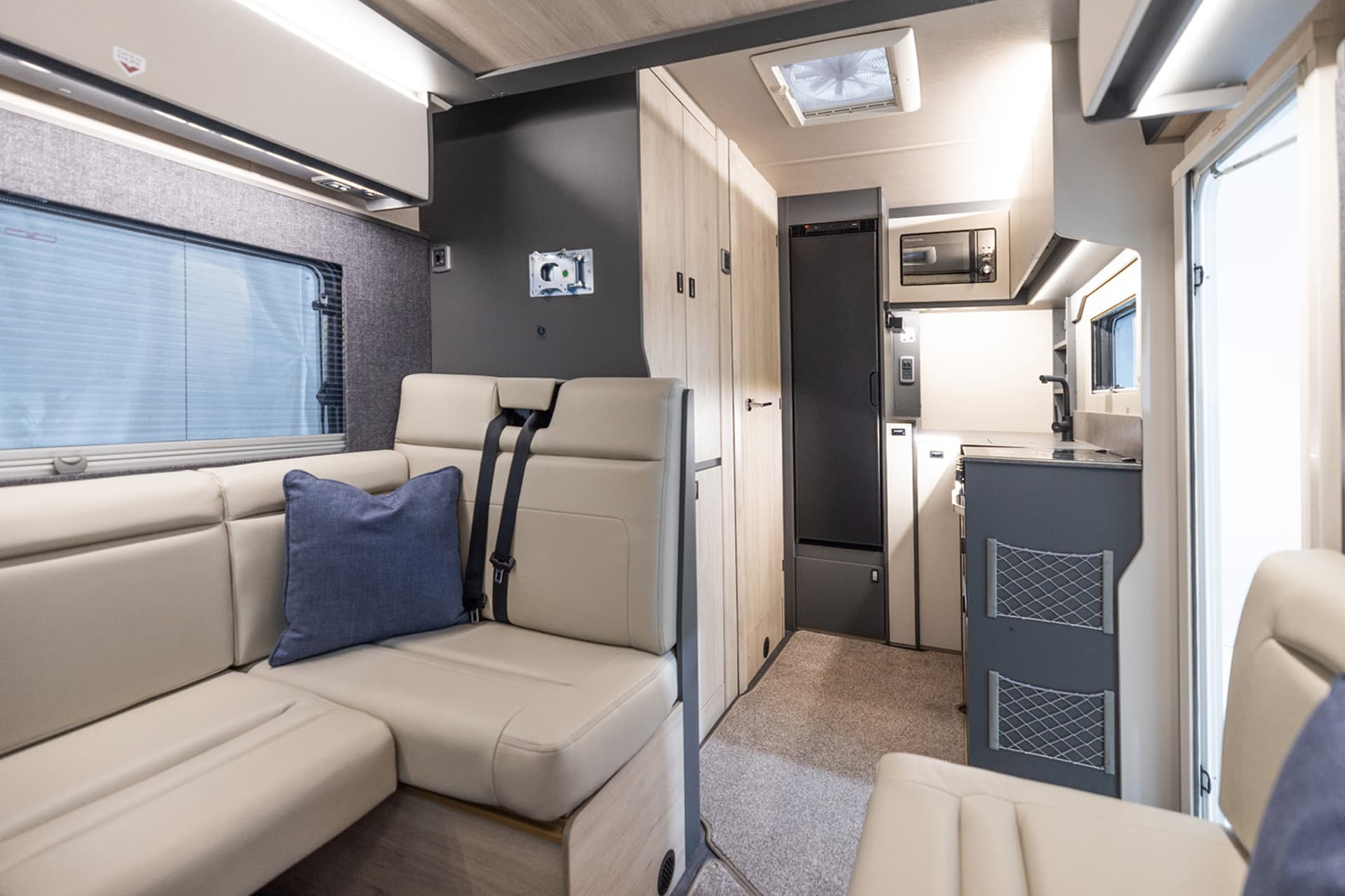 Also, the dinette’s bench seating helps the interior to feel open, with an adjustable table and the option of adding a drop-down bed to further maximise space.