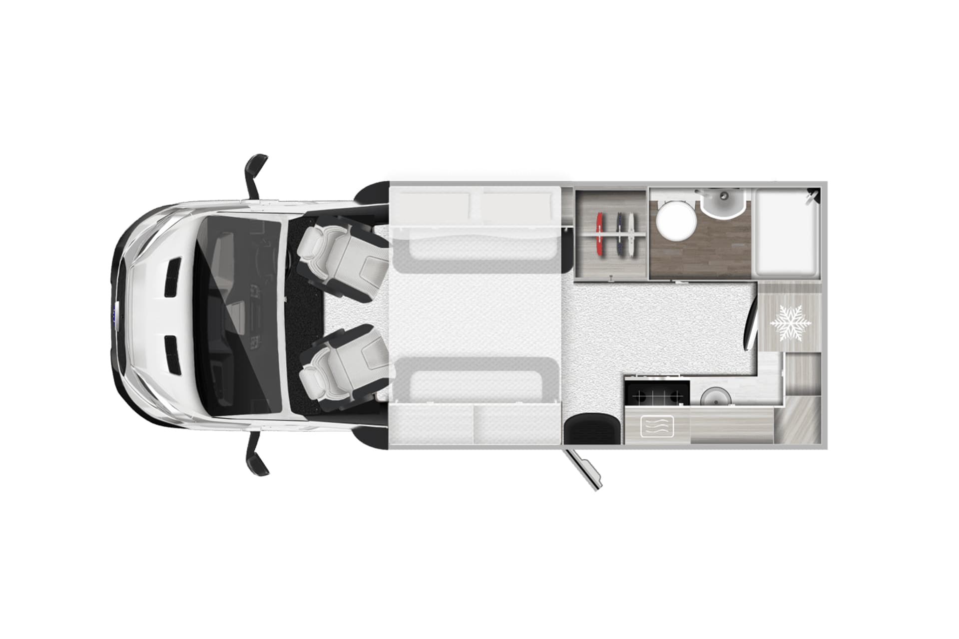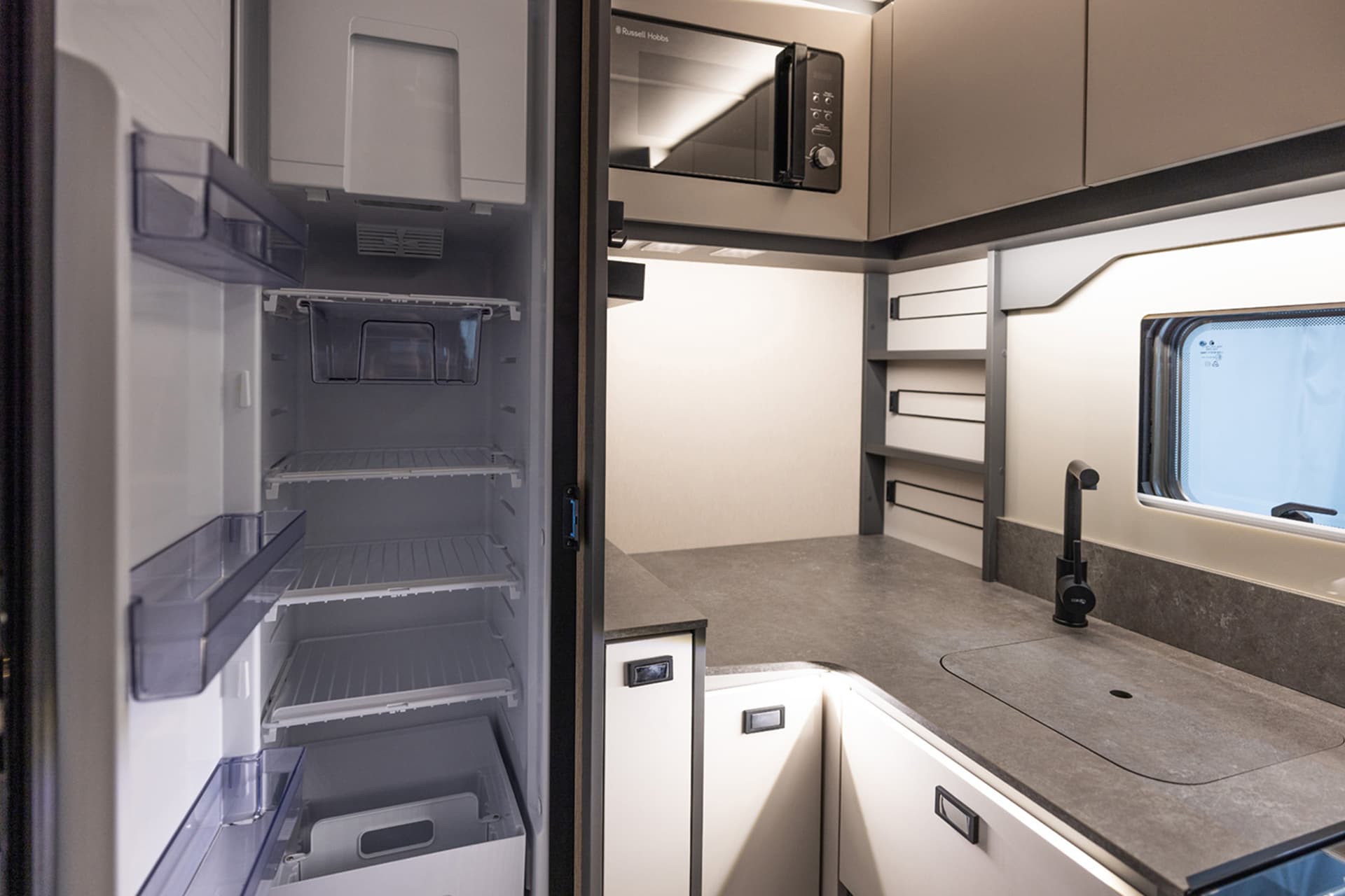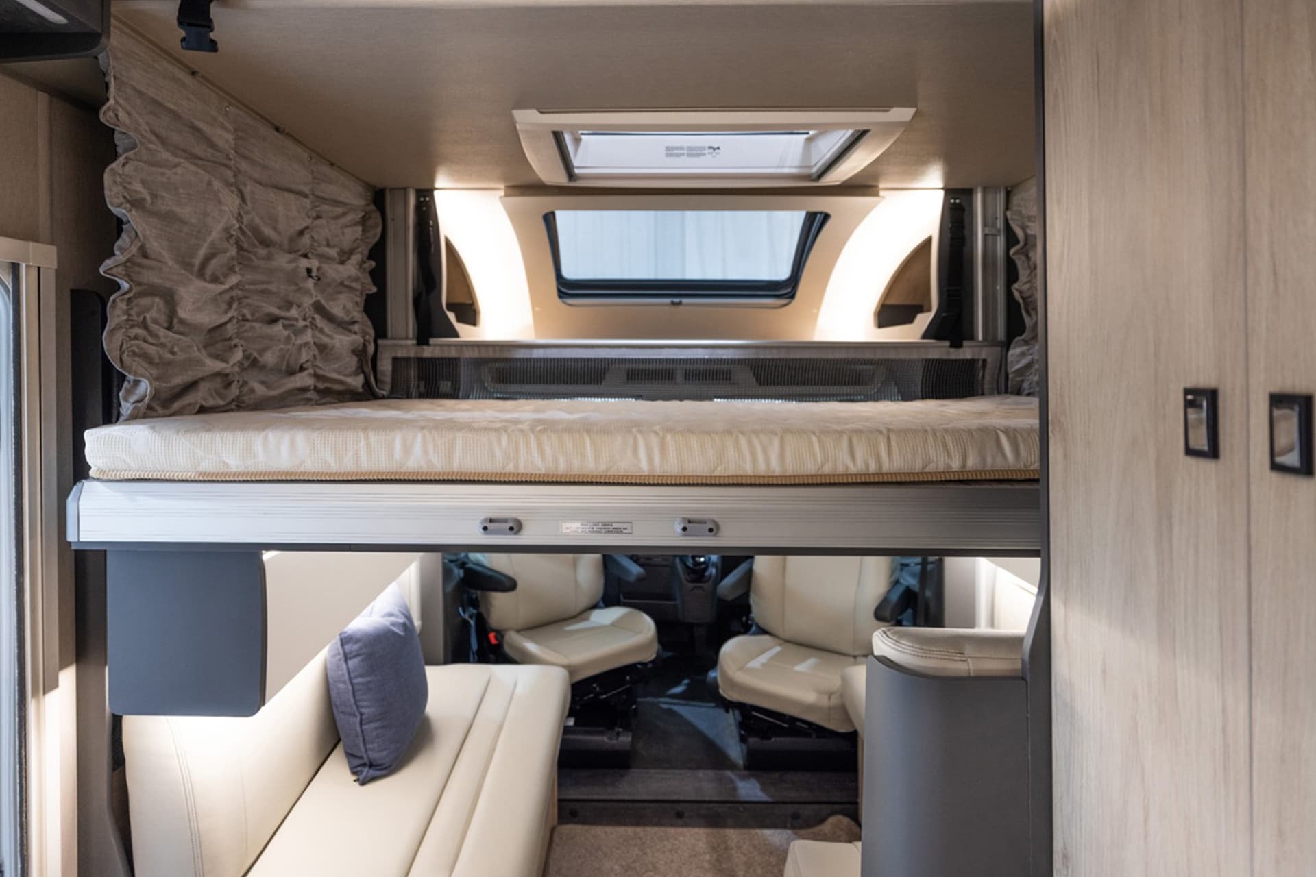 Also, the dinette’s bench seating helps the interior to feel open, with an adjustable table and the option of adding a drop-down bed to further maximise space.
