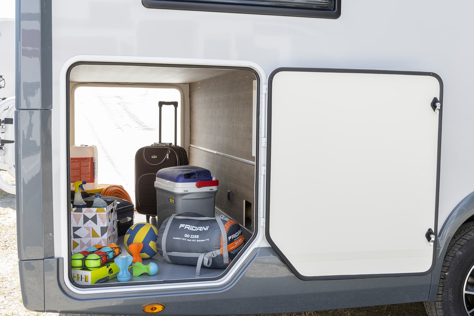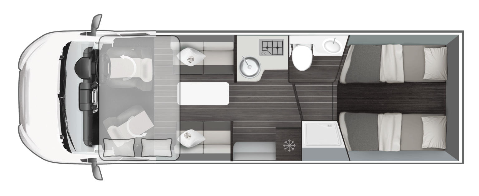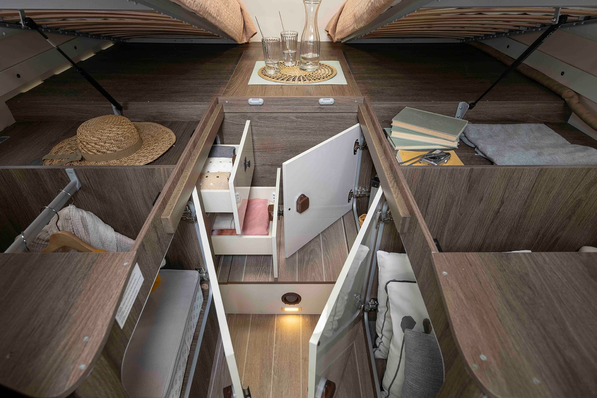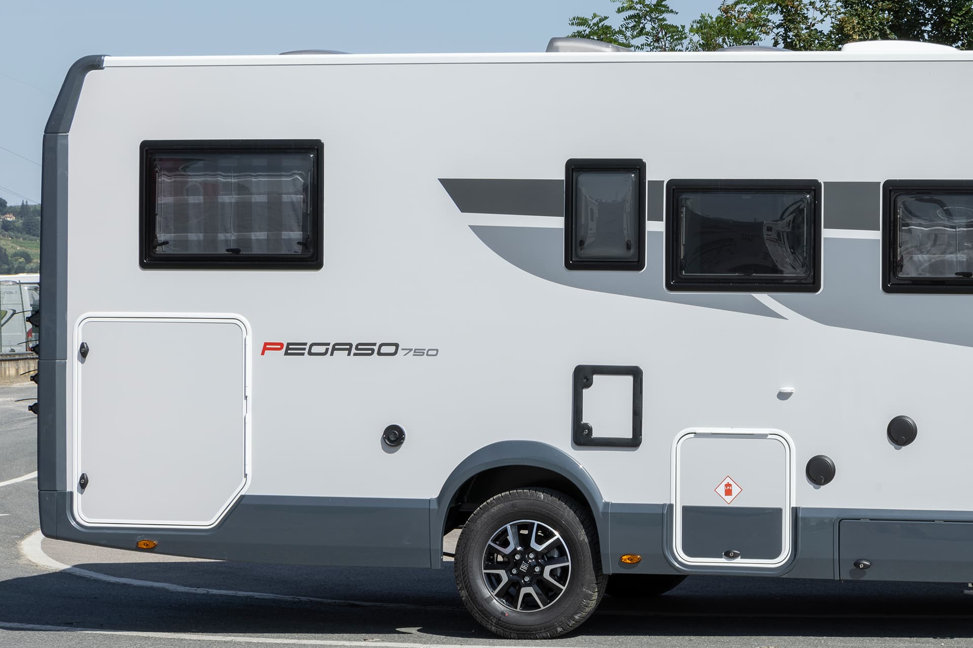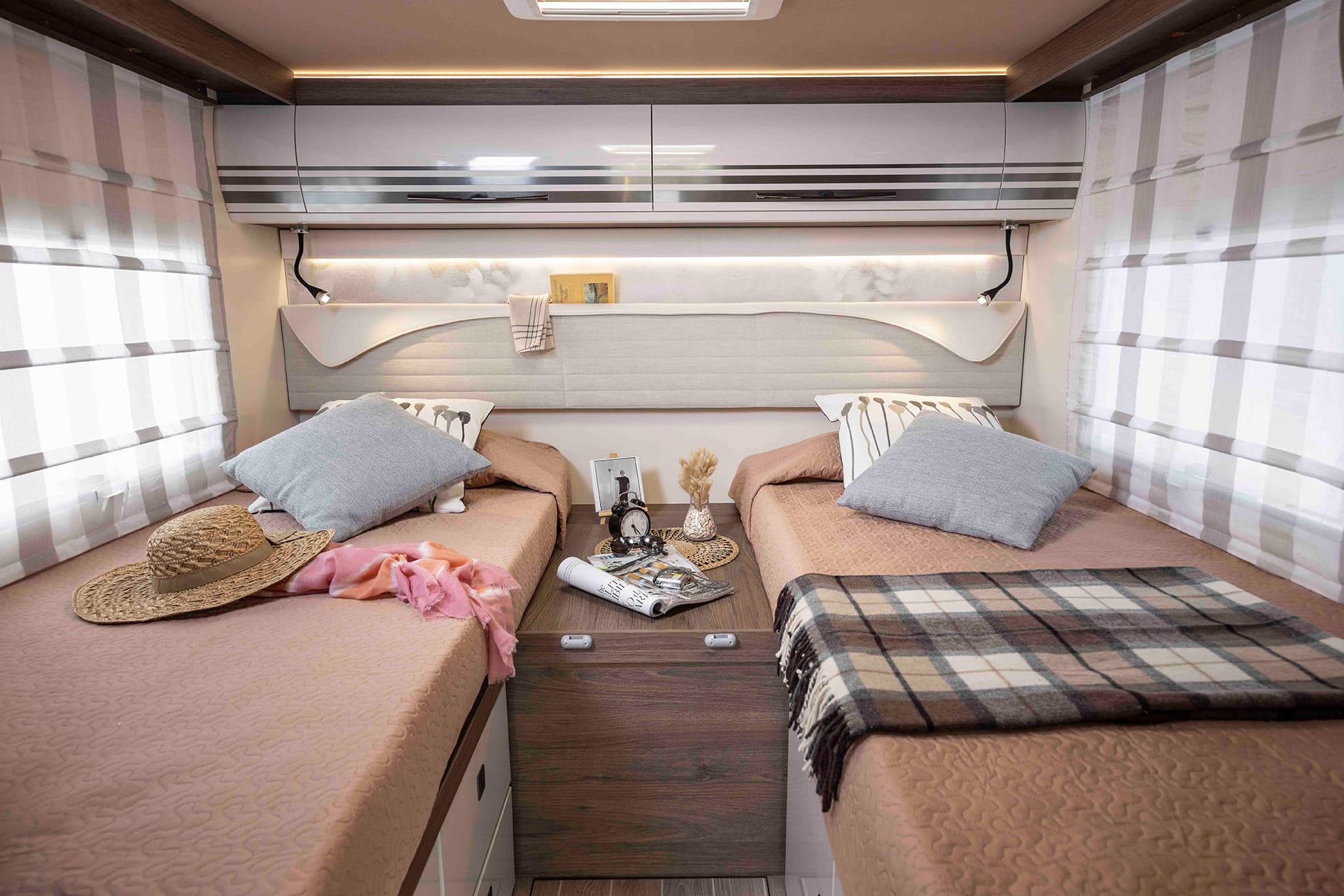 For the ideal mix of luxury and convenience, look no further than the Pegaso 750. If your family or group of friends have had a long, activity-filled day, nothing beats the ease of use of the sleeping areas here. There are two fixed single beds towards the back, which are both full of comfort and ideal for children; alongside this, you’ll find a large electric drop-down double bed for the couples. These beds offer the usual quality and relaxation of the rest of the Pegaso range, but without the need to spend extra time preparing them.
