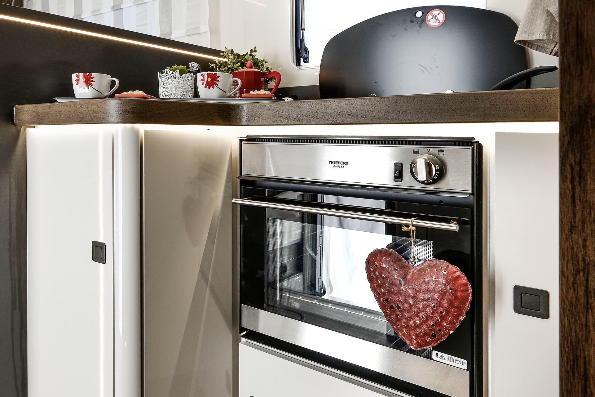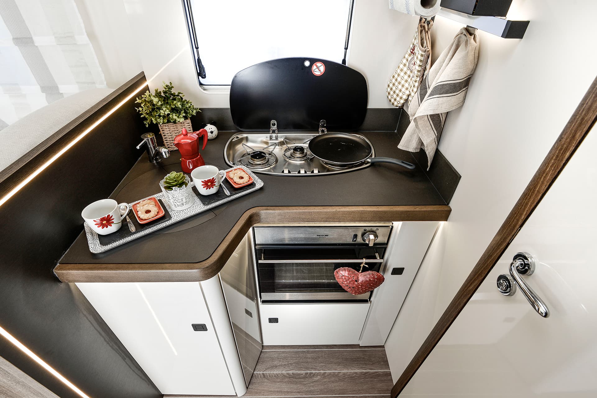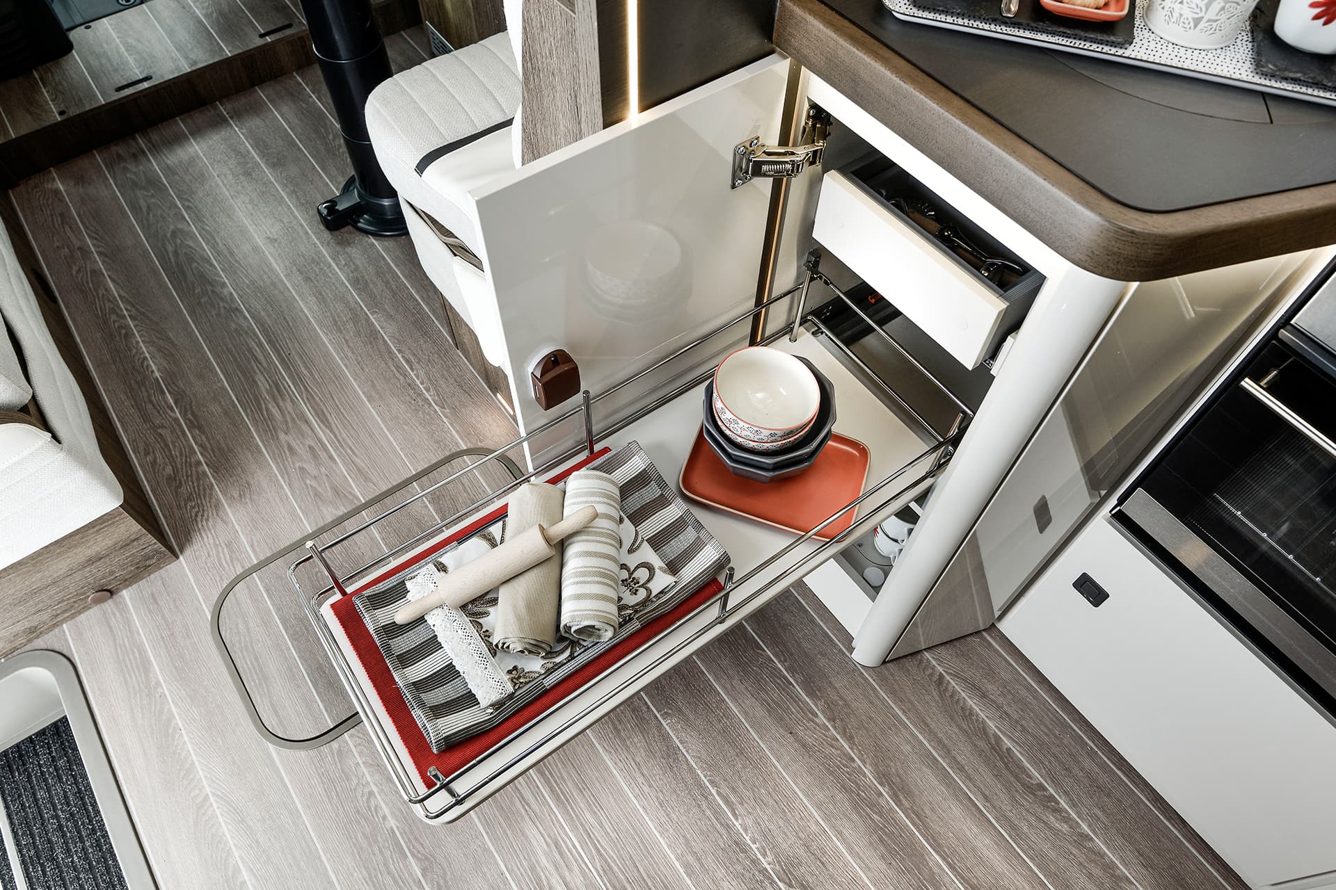 Featured in this interior is the large rear washroom, which covers the width of the motorhome and includes a shower, toilet and sink fitted as standard. There’s also the L-shaped kitchen, which has a great amount of space for cooking any kind of meal on the go.