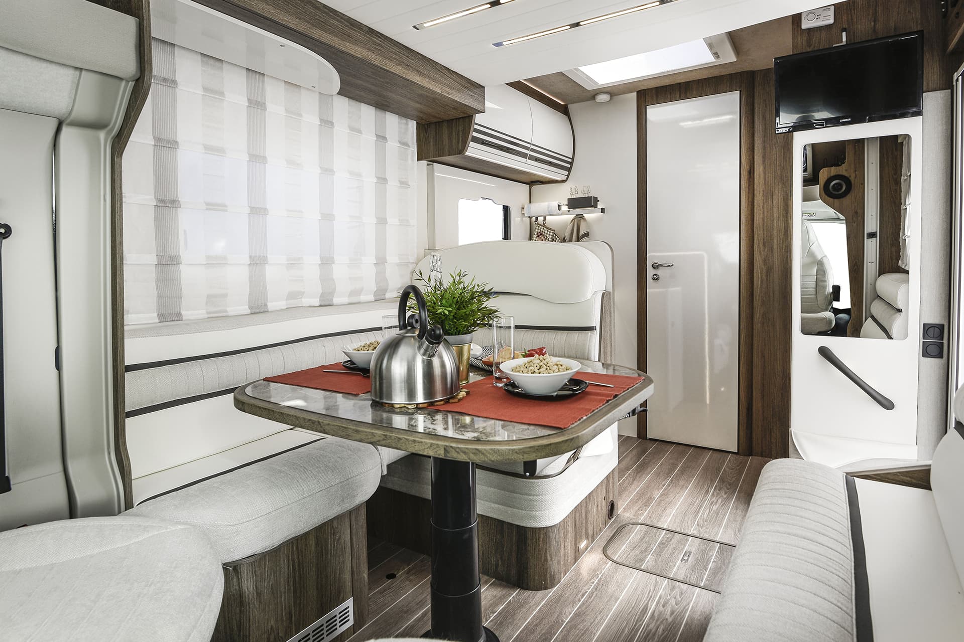 Roller Team’s T-Line 590 has all the features you need in a compact (less than 6 metre long) package. The shorter length and Fiat Ducato chassis make driving a breeze, but there’s still lots of room in its luxurious interior – easily enough to sleep up four people in fact.