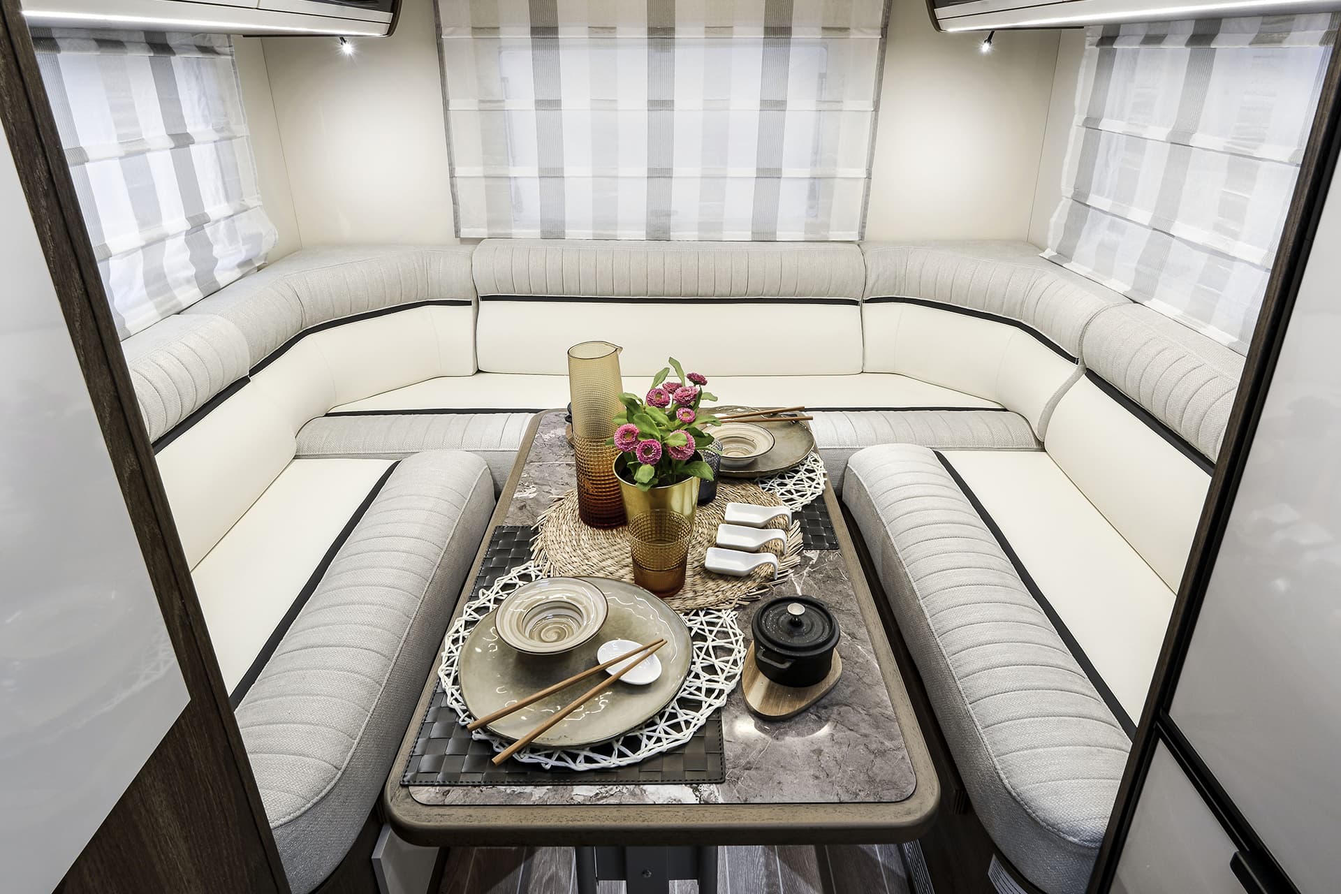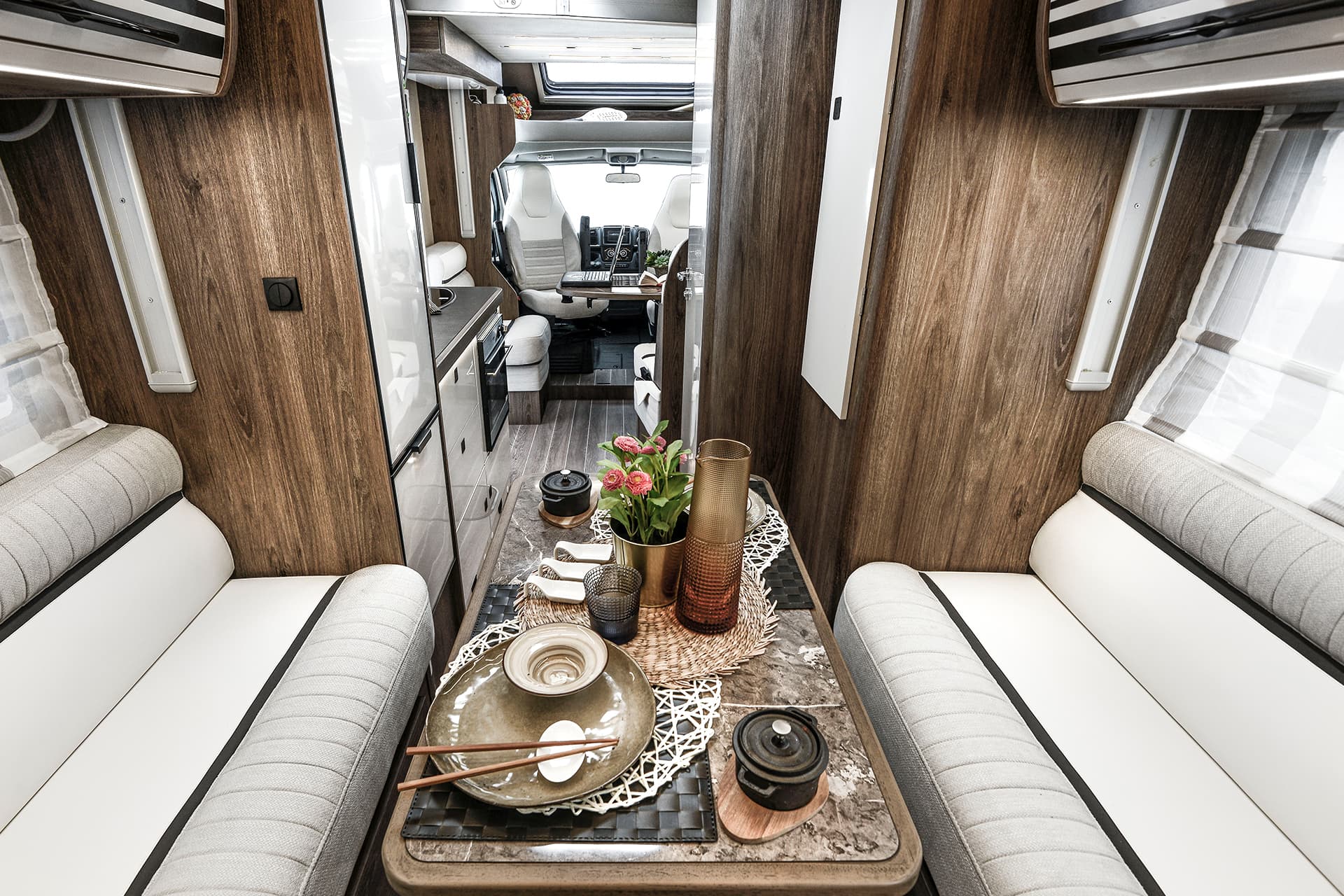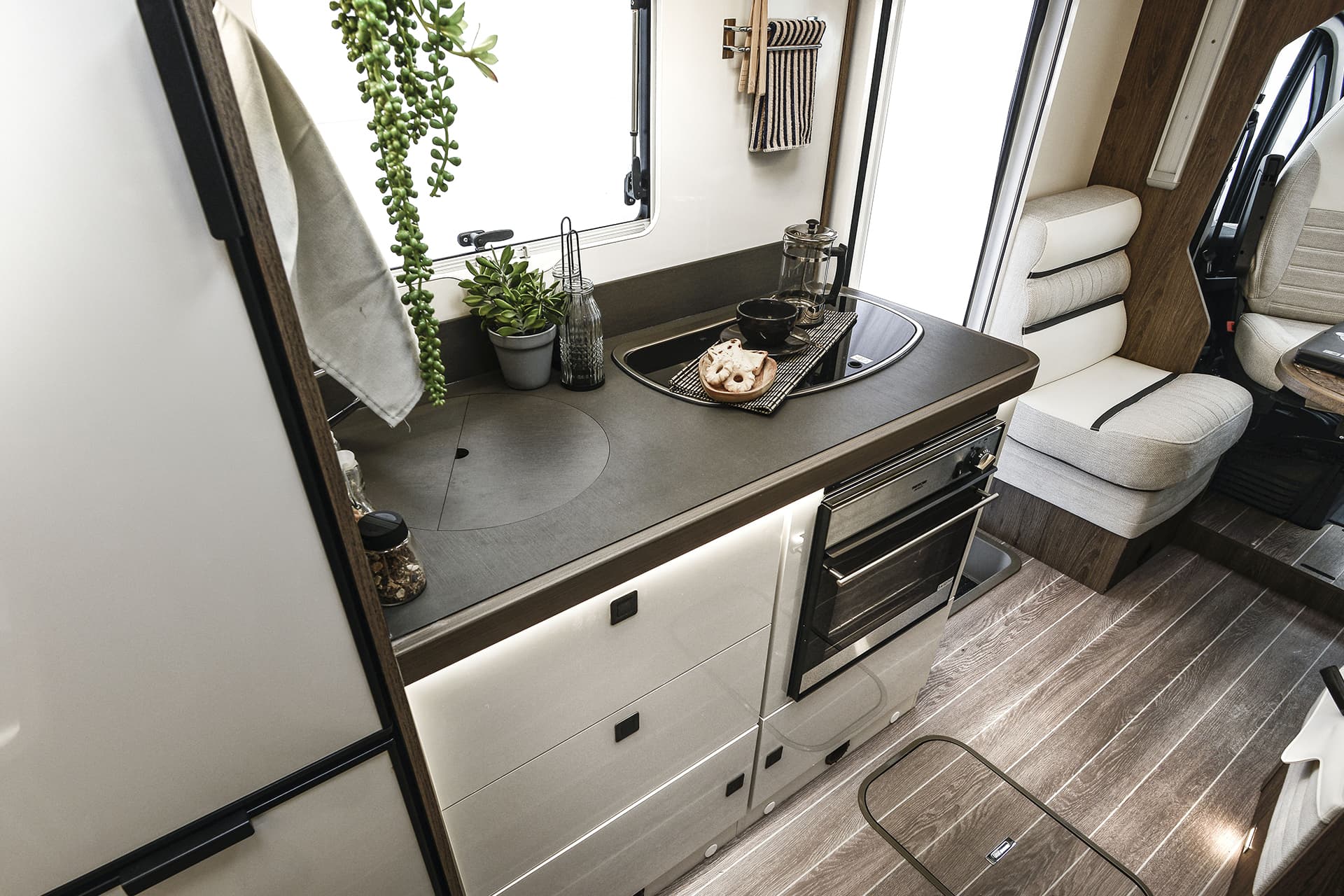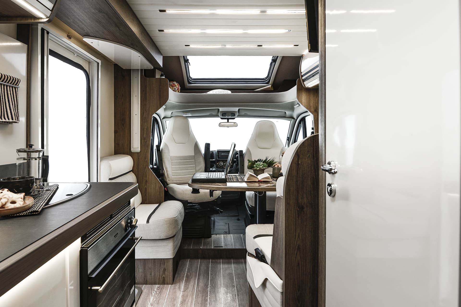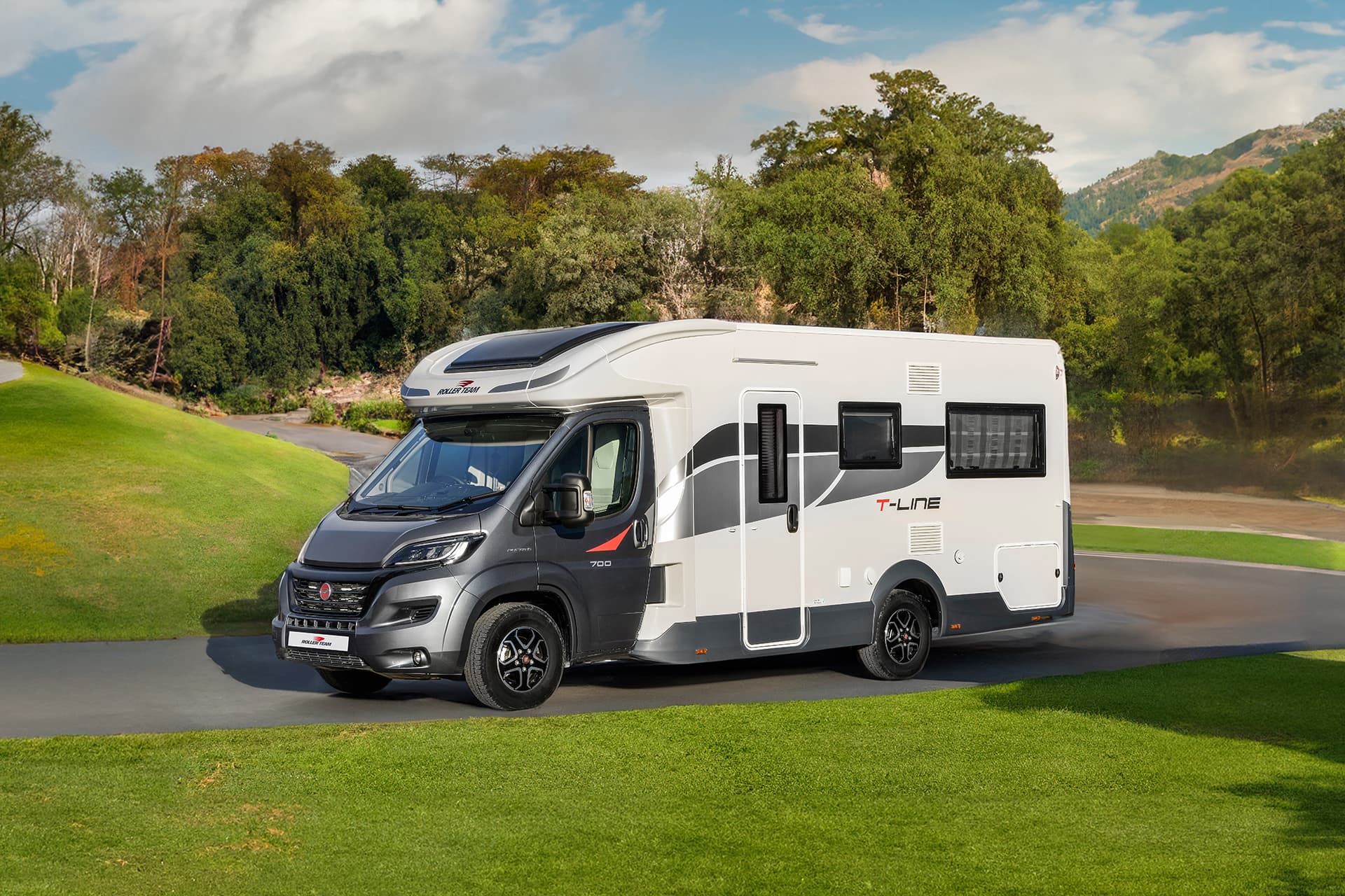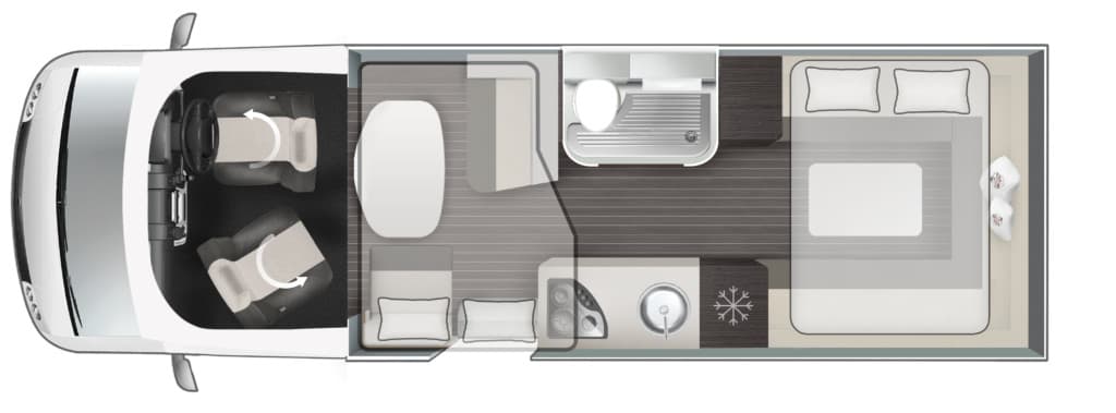 The T-Line 700 is a motorhome with expert craftmanship at the forefront. Roller Team’s clever design work allows it to contain the usual range of features into a vehicle with a shorter length than many other family motorhomes. Step inside, and you won’t even notice the difference, with the spacious living area bolstered by the cosy rear lounge. The sleeping areas are a great example of the competent design in action, with two drop-down double beds that are easy to prepare and allow groups of up to four to get a restful night’s sleep.