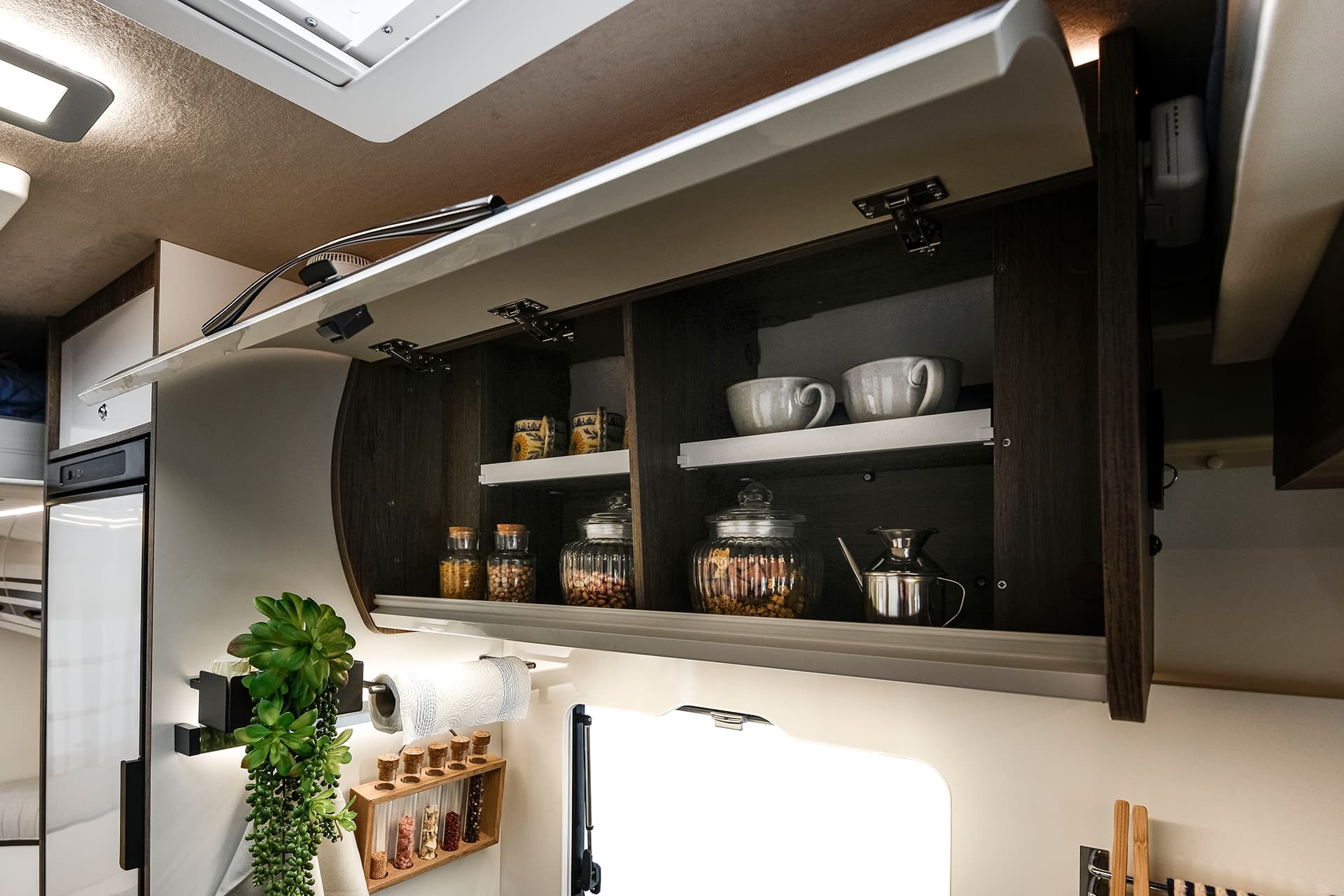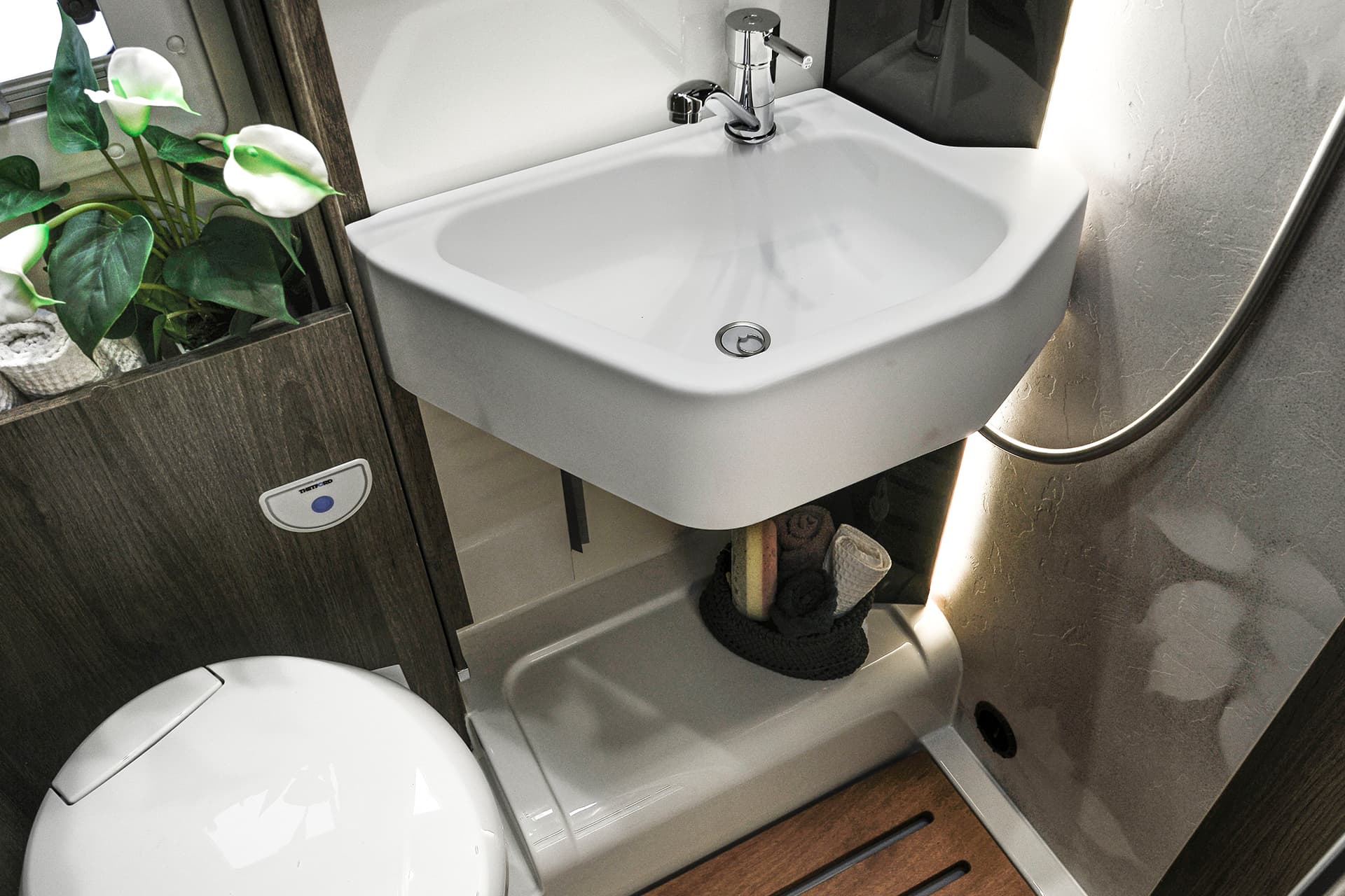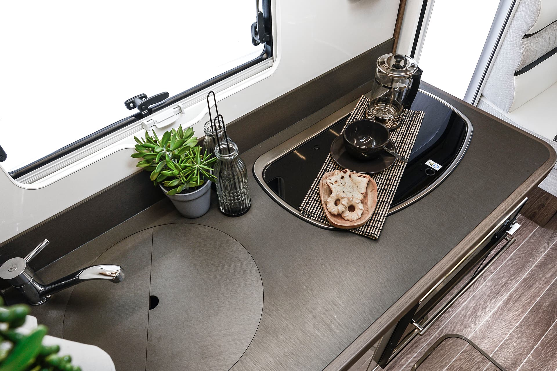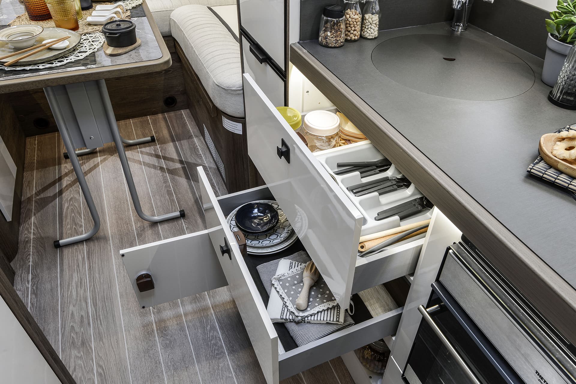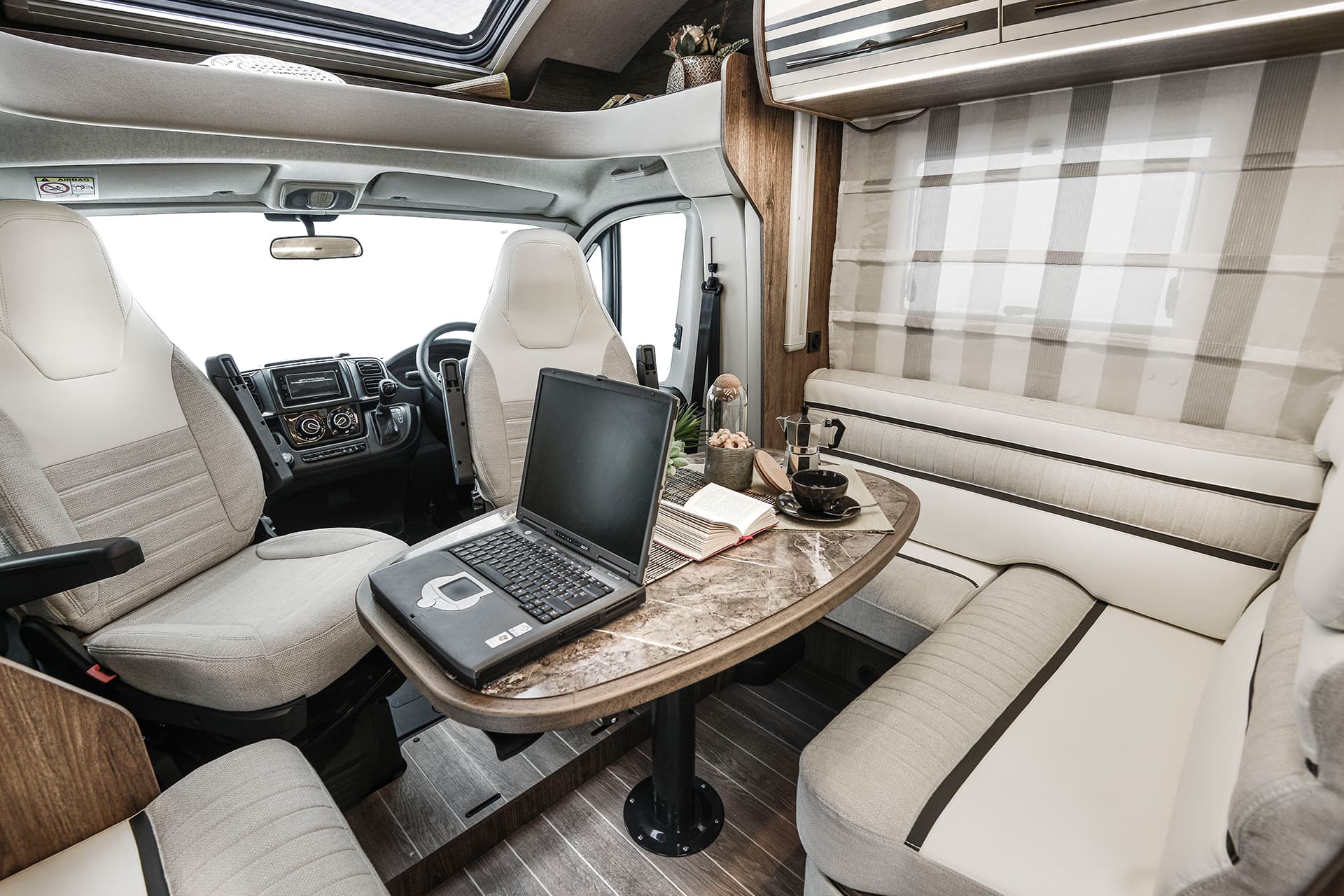 The T-Line 700 is a motorhome with expert craftmanship at the forefront. Roller Team’s clever design work allows it to contain the usual range of features into a vehicle with a shorter length than many other family motorhomes. Step inside, and you won’t even notice the difference, with the spacious living area bolstered by the cosy rear lounge. The sleeping areas are a great example of the competent design in action, with two drop-down double beds that are easy to prepare and allow groups of up to four to get a restful night’s sleep.