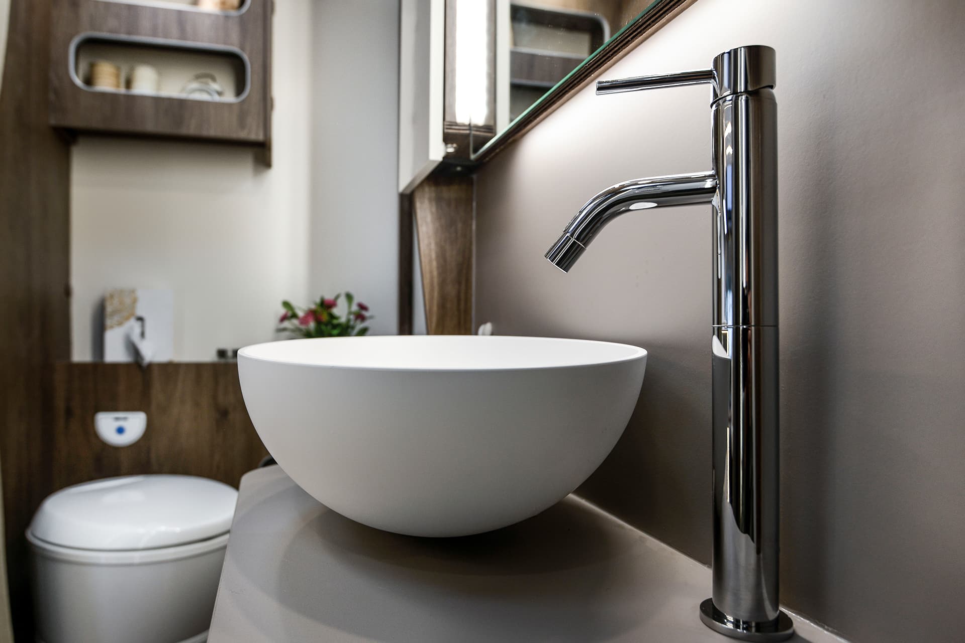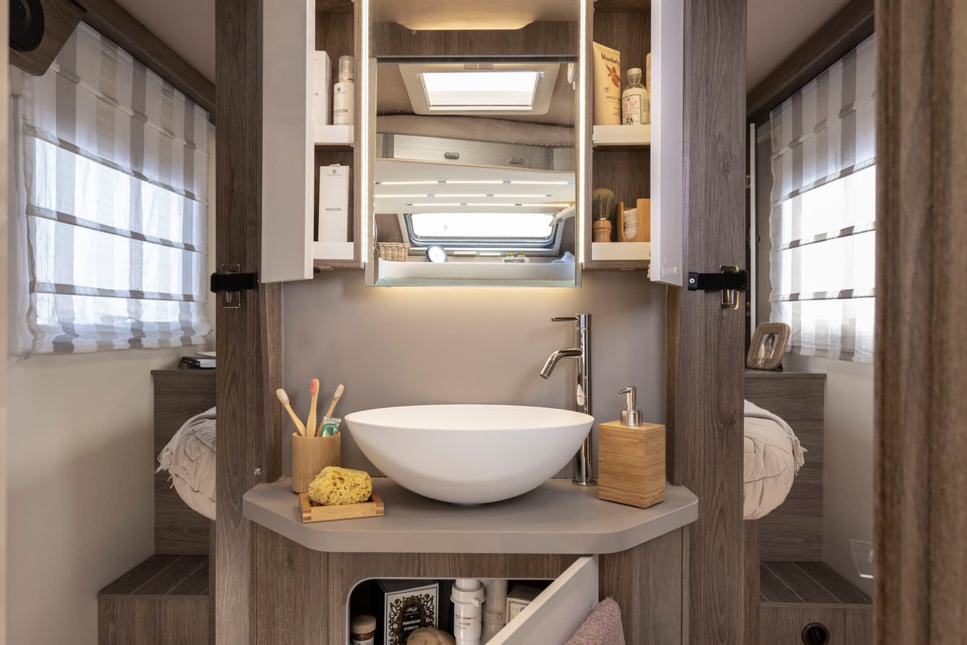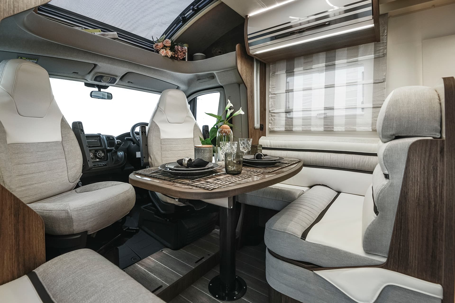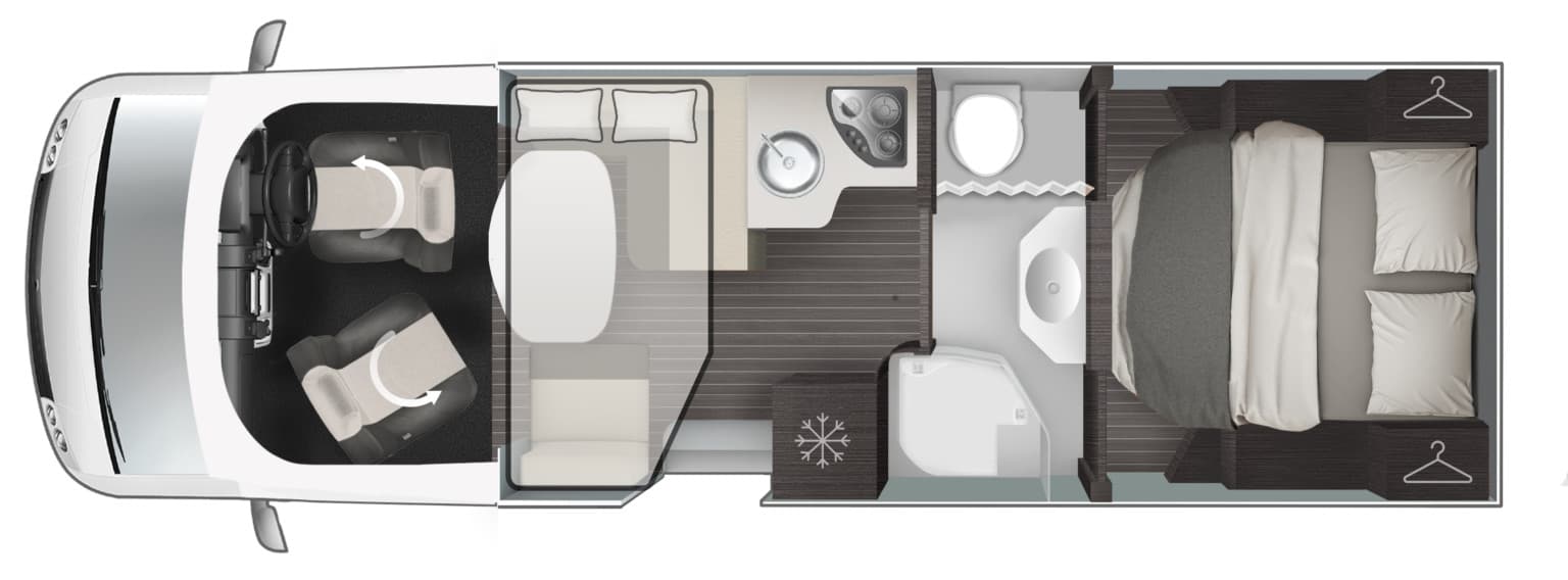 With its high-end sleeping arrangements and large range of desirable features, the 740 is the pinnacle of couple’s luxury in the T-Line series. A unique feature of this motorhome is the central washroom, with the sink, shower and toilet having their own neatly placed areas. This is then followed by the secluded bedroom, and its large and comfortable rear-island bed to give you that 5-star hotel feel.