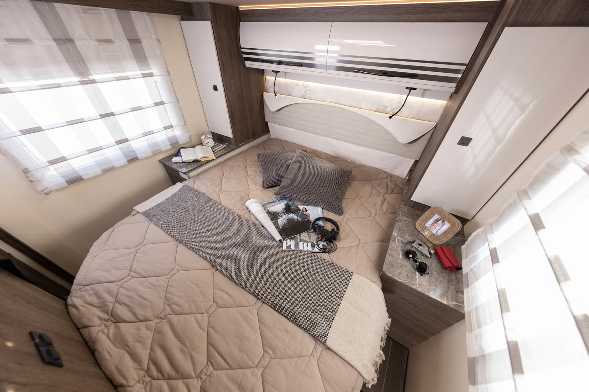 The 740 can still sleep up to four people too, as there’s another ergonomically designed electric-drop down double bed towards the middle – perfect for guests or children.