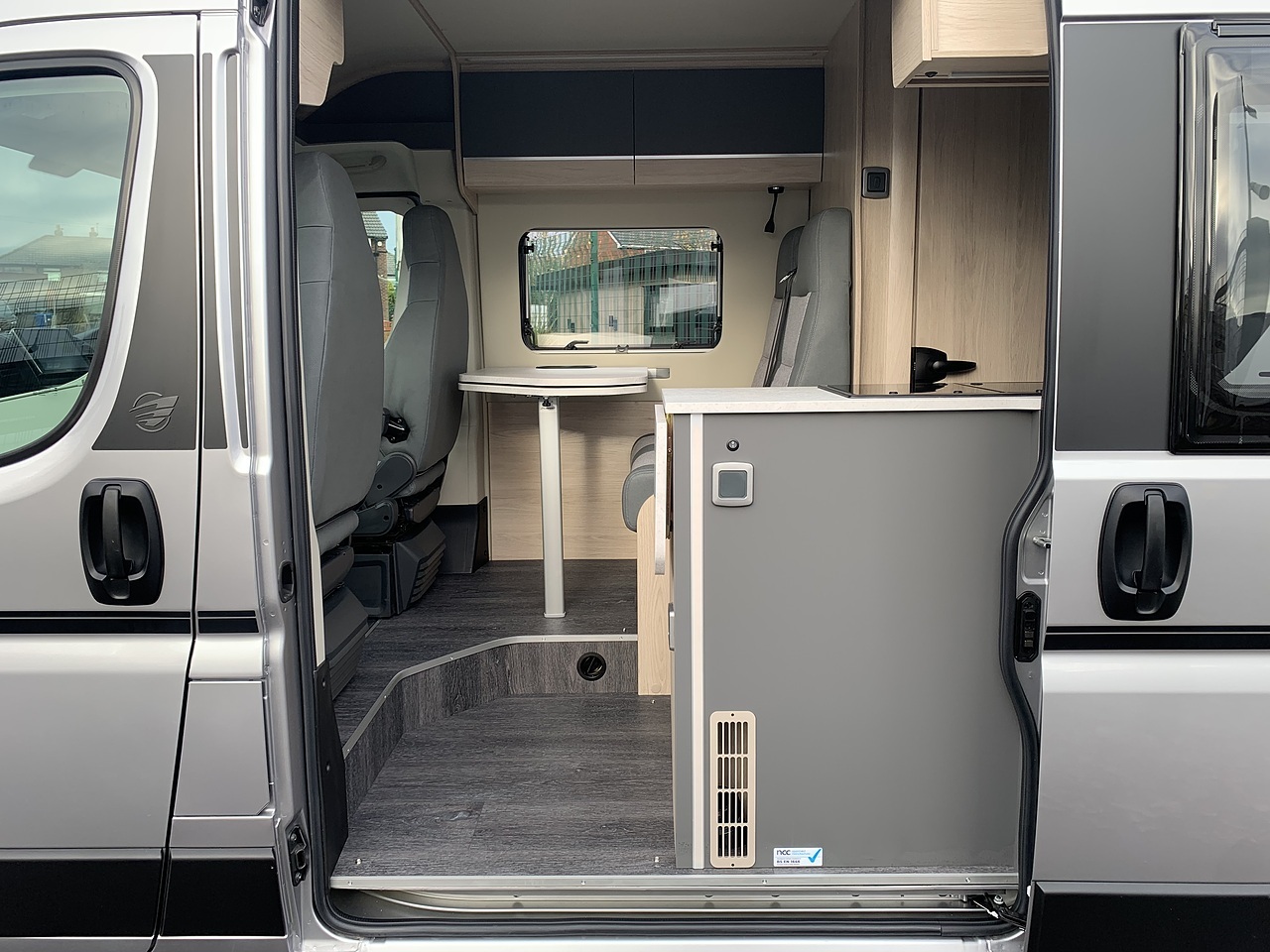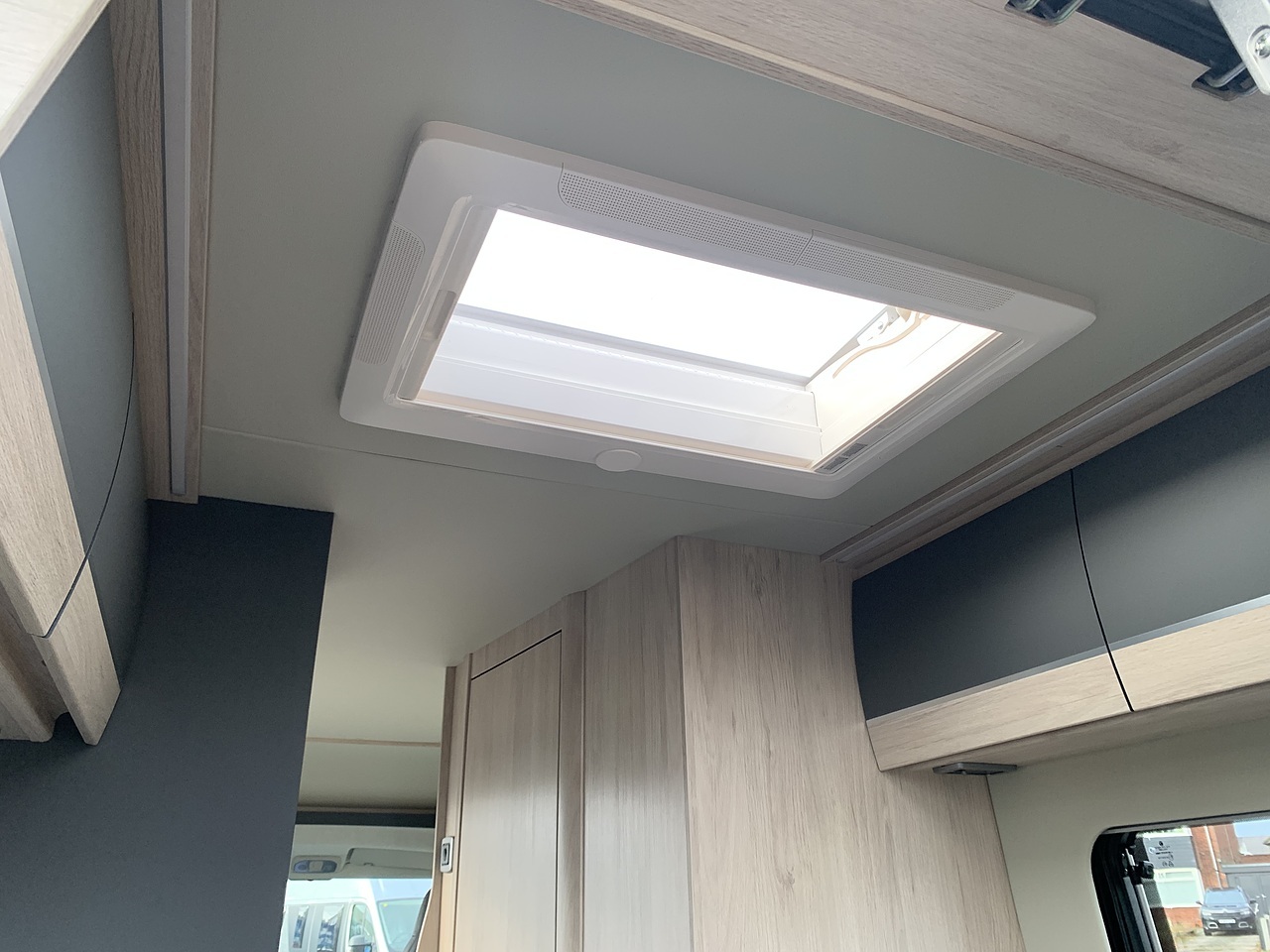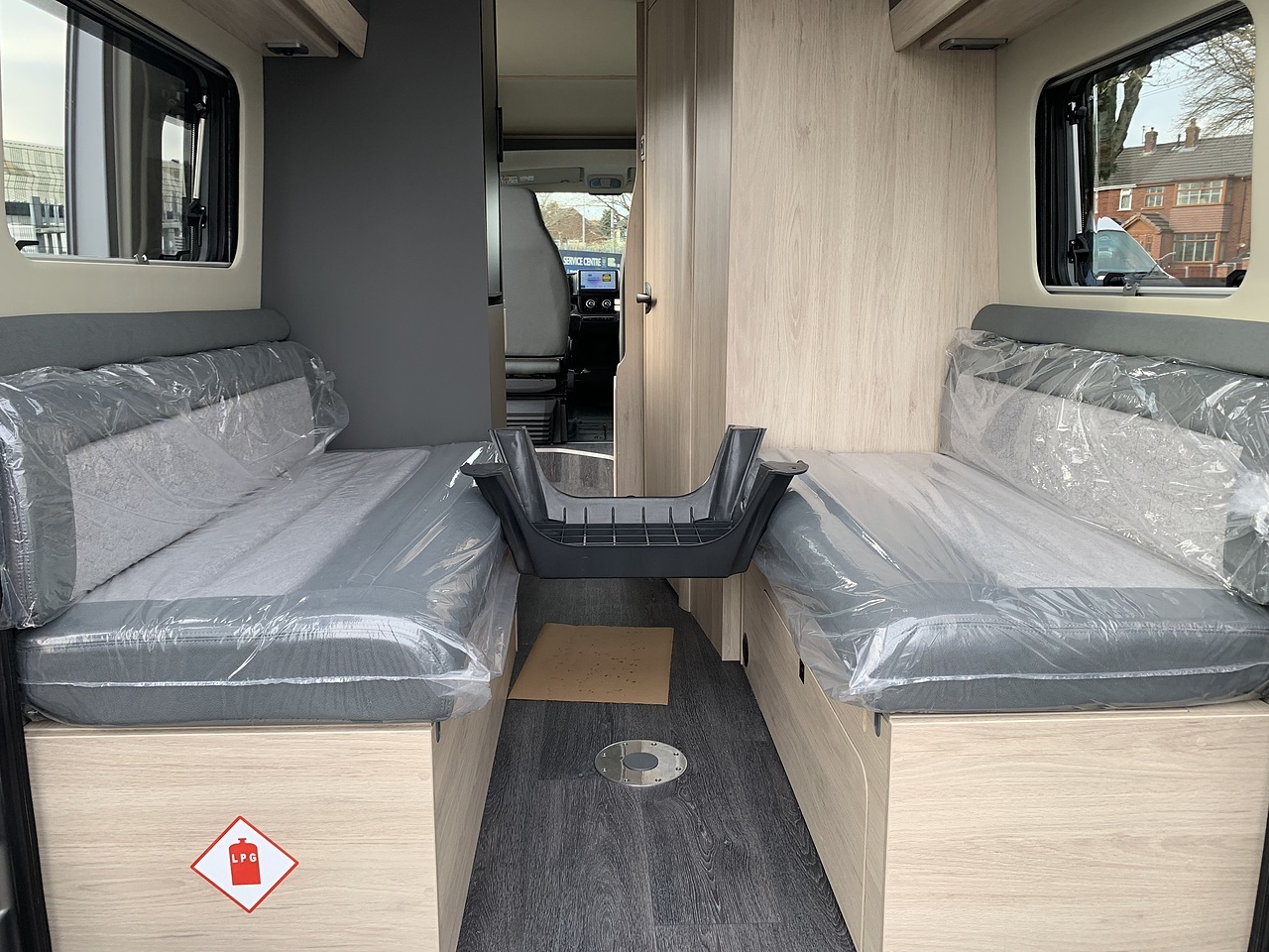 Features of this motorhome include: 2 Berth, 4 Travel, Fiat 6-speed manual gearbox, alloy wheels, Loose Laid Carpets, bathroom window, additinal lesuire battery, aerial prep, revering camera, isofix,Android Auto + Apple Carplay, Cab Blinds, Artense Grey, daytime running lights, skylights, cassette toilet, cruise control, traction+, hill descent, blinds and flyscreens, Pull out double bed, hot and cold shower unit, sink, oven/grill, gas hob, solar panel, fridge/freezer, fresh/waste water tanks, gas and electric blown air heating, electric front windows, wardrobe, USB Charging points.
