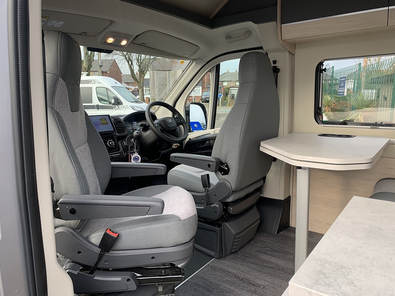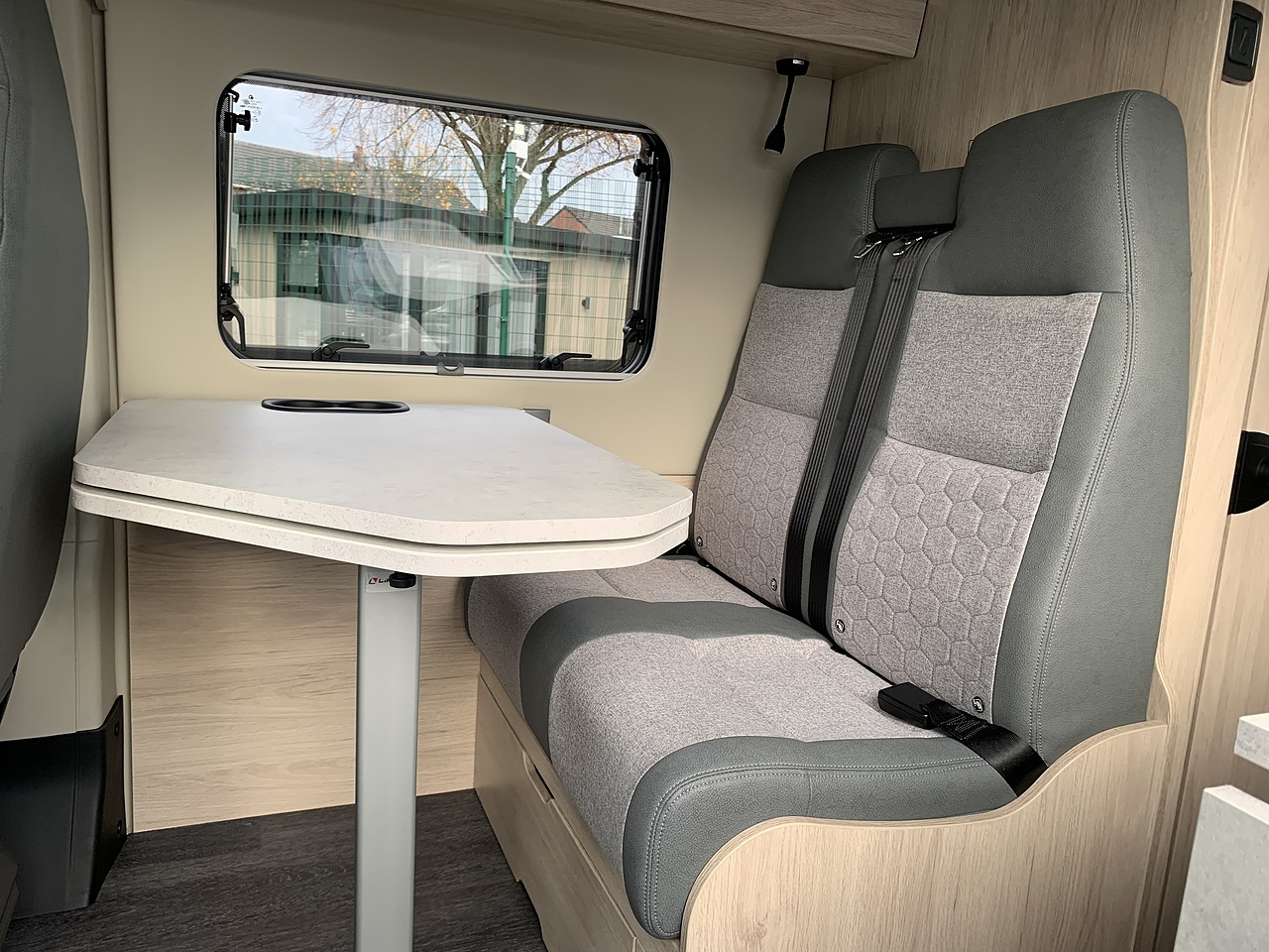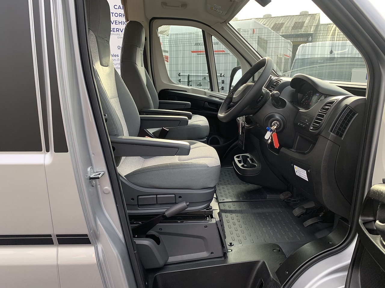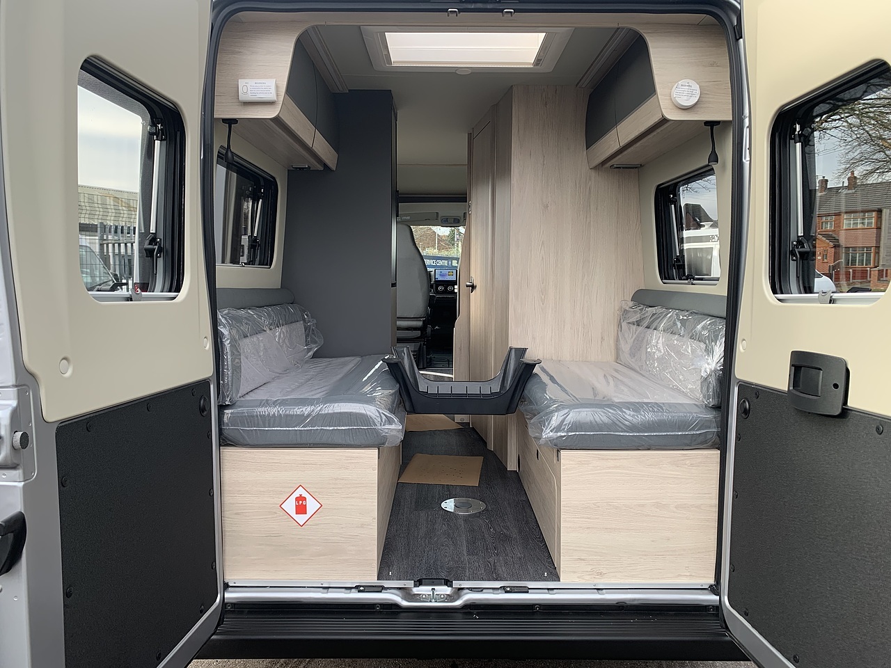 Features of this motorhome include: 2 Berth, 4 Travel, Fiat 6-speed manual gearbox, alloy wheels, Loose Laid Carpets, bathroom window, additinal lesuire battery, aerial prep, revering camera, isofix,Android Auto + Apple Carplay, Cab Blinds, Artense Grey, daytime running lights, skylights, cassette toilet, cruise control, traction+, hill descent, blinds and flyscreens, Pull out double bed, hot and cold shower unit, sink, oven/grill, gas hob, solar panel, fridge/freezer, fresh/waste water tanks, gas and electric blown air heating, electric front windows, wardrobe, USB Charging points.