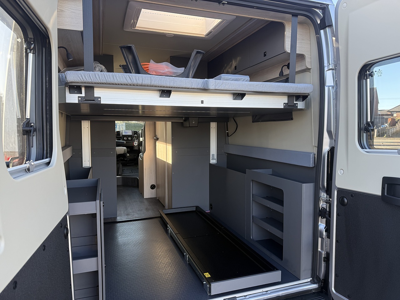 With an electric bed that lowers for easy access and raises to a high level to accommodate larger items in the garage below, this versatile and economical campervan makes your dreams of family adventures a reality.