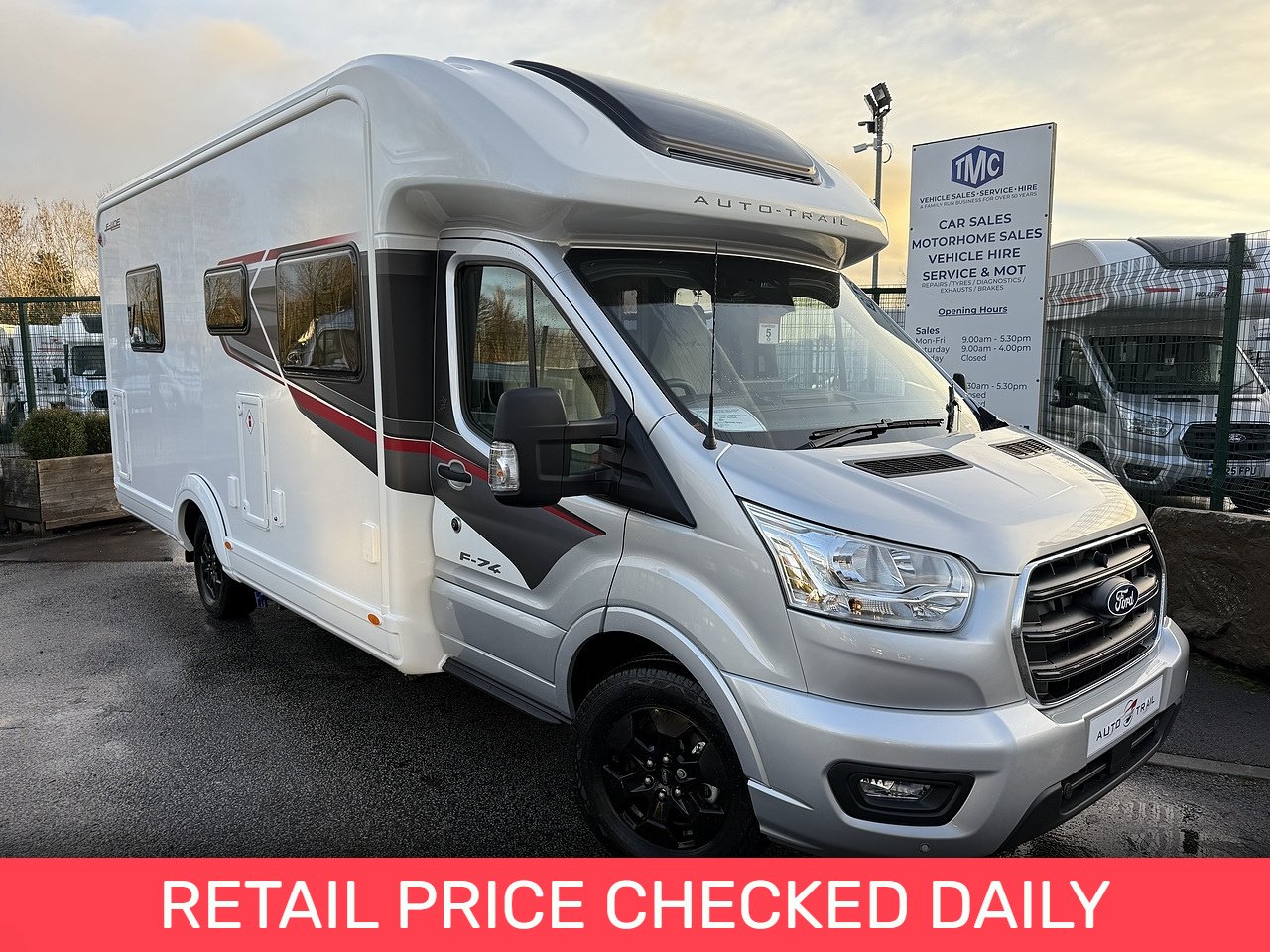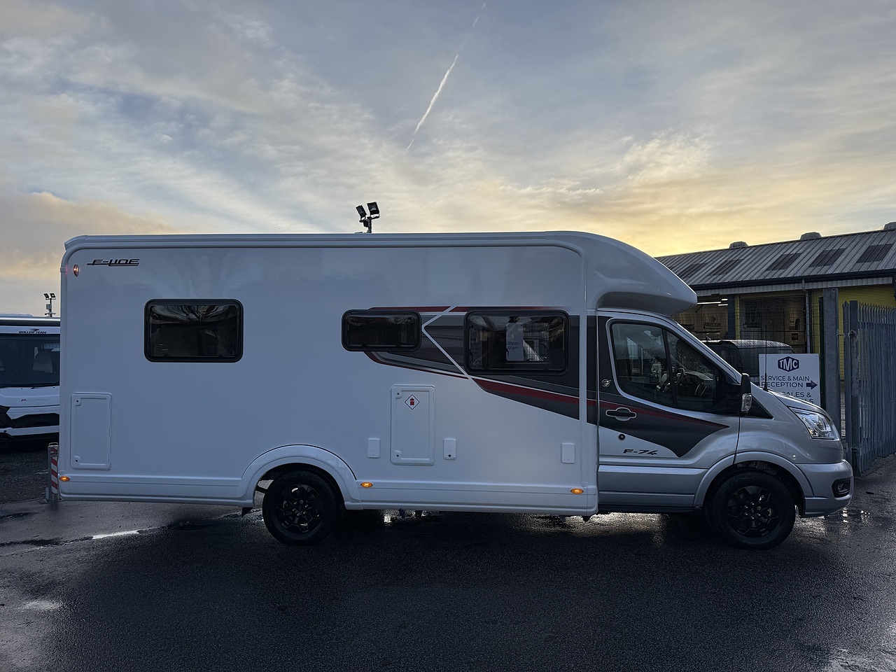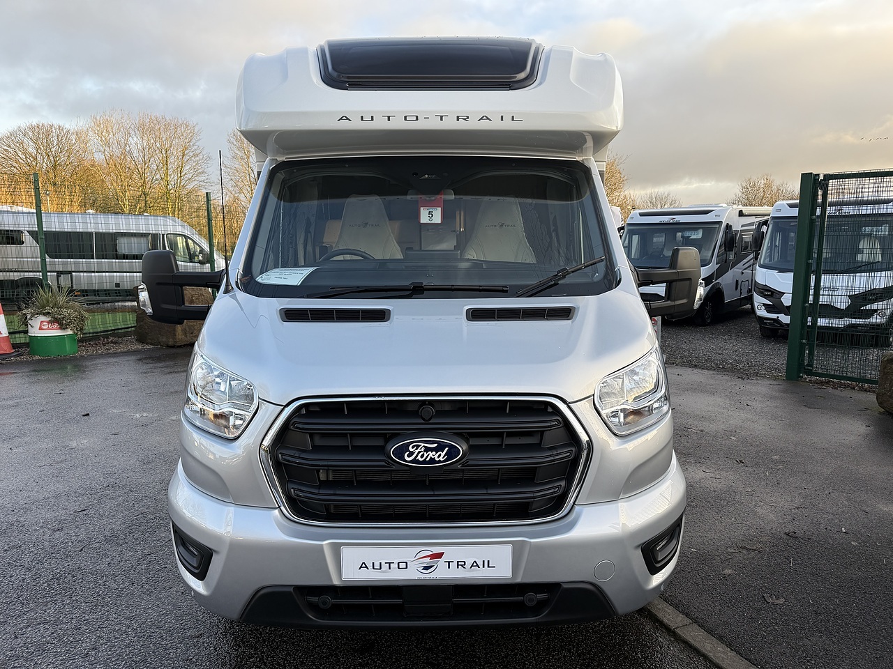 The Auto-Trail F-Line F74 is a popular low-profile, coachbuilt motorhome built on a Ford Transit chassis, featuring a spacious rear island bed and an optional electric drop-down bed in the front lounge, providing comfortable accommodation for up to four people.