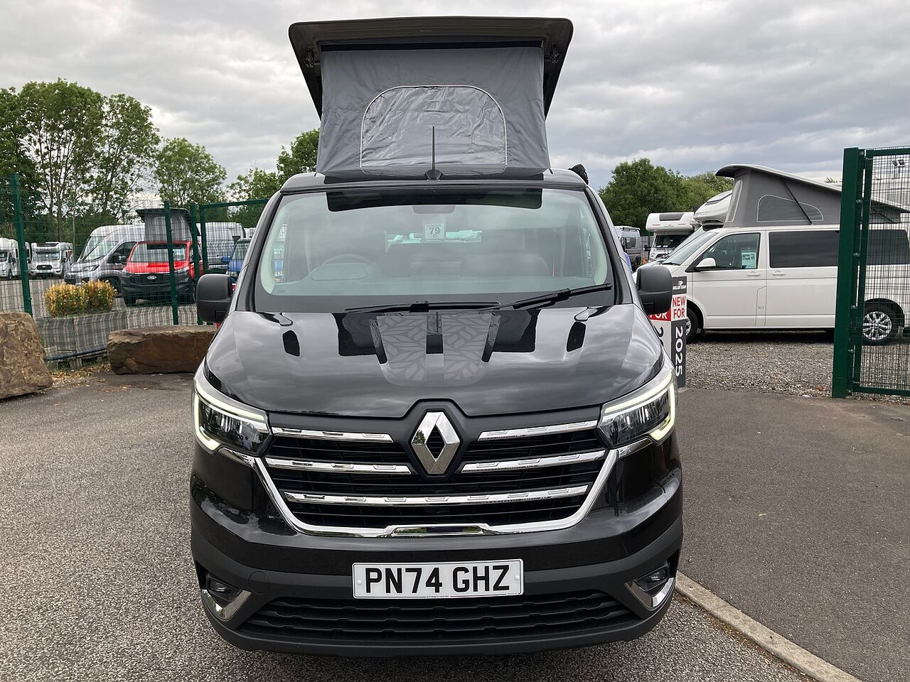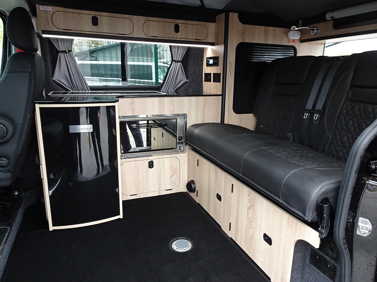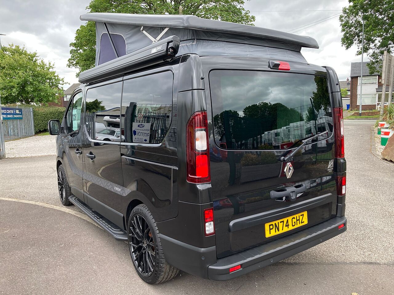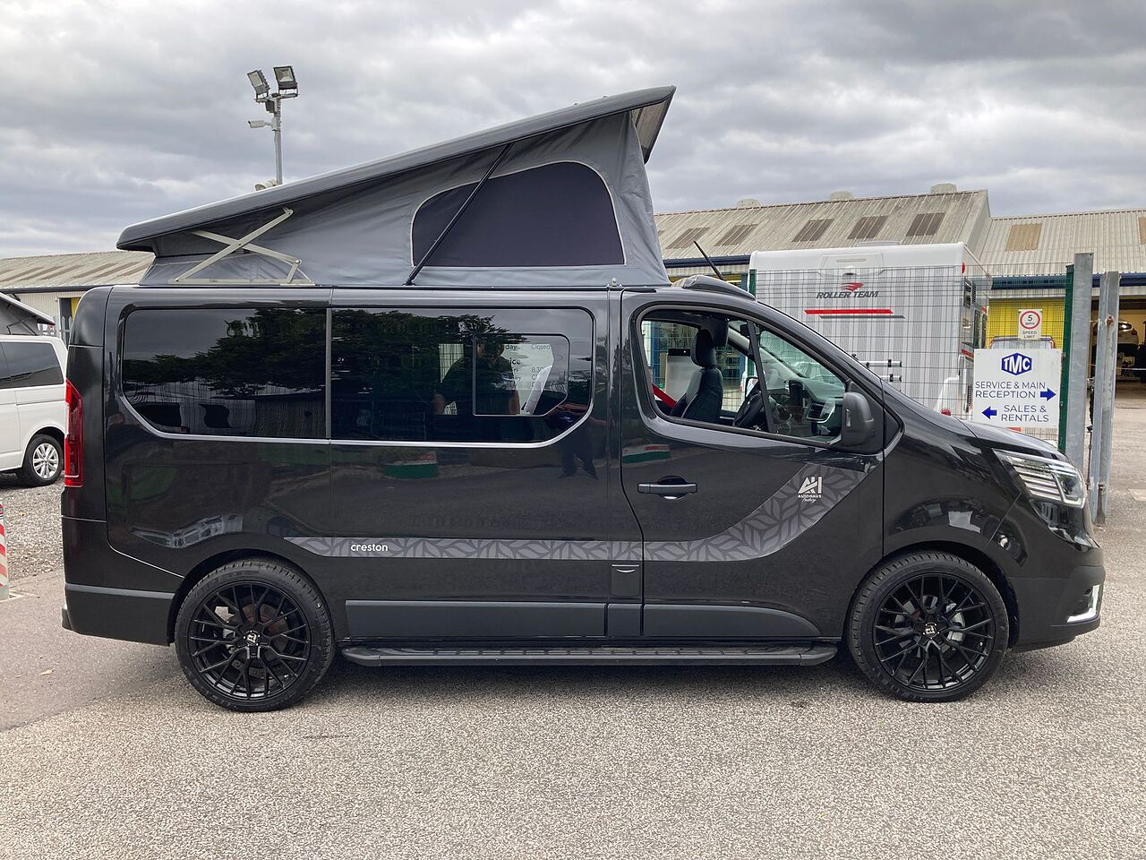 The all new Autohaus Creston in stunning Deep Black. This versatile Camper is based on the latest Renault Traffic 150ps Euro 6 Automictic and comes with LED Daylight running headlights, taillights, front and rear parking sensors, elecetric folding heated mirrors, heated tailgate with wash-wipe, DAB radio with app connect, single front seats with armrests, height adjustment, lumber support and factory immobiliser alarm. The Creston conversion comes with an impressive specification as standard which includes, Reimo front elevating roof, Roof bed, Tinted windows all round with o/side front rear opening, Blackout curtains and cab silver screen, Fully sound proofed insulated lined and trimmed, Safety flooring, Creston furniture with Tristone worktop, Table on pole, Combination twin hob and sink, 50Ltr Fridge freezer, 20Ltr Oven-grill, Webasto diesel hot air heater, 30Ltr Fresh water tank with in-line pump, Gas locker with all fittings, Mains 240v hook up with RCD charger system, 240v Sockets, Split charger system with 100 amp AGM Leisure battery, LED lighting, 12v sockets, Rib 120cm rear seat bed with 2-3-point seat belts, Leather upholstery, Passenger front seat fitted with swivel base, Cabin mats, F45 awning with LED light, Side steps, Alloy wheel upgrade, Autohaus decals, Safety certificates gas and electric.