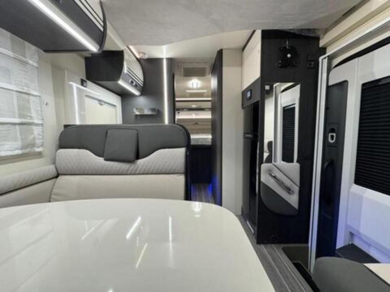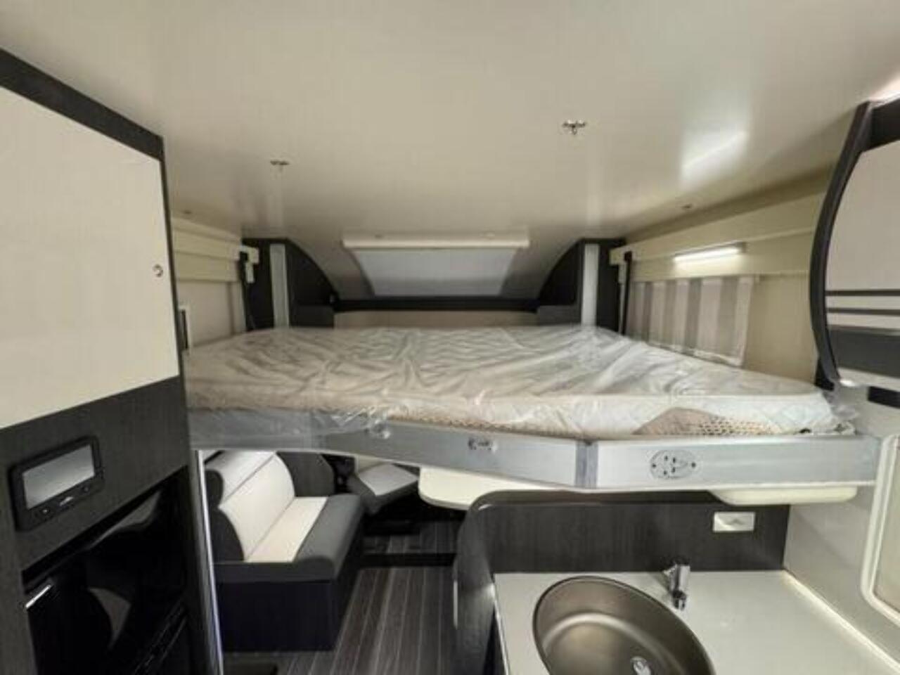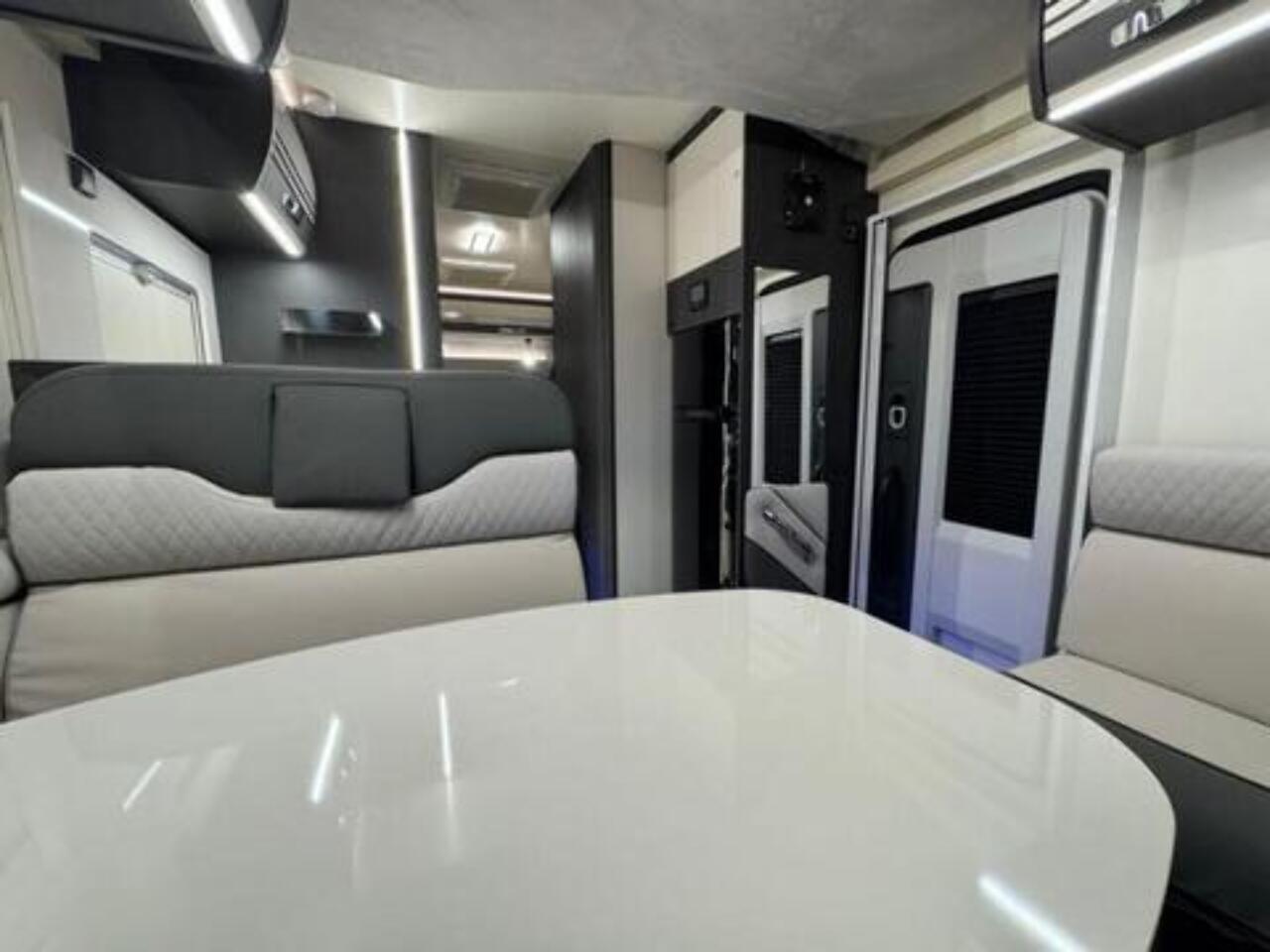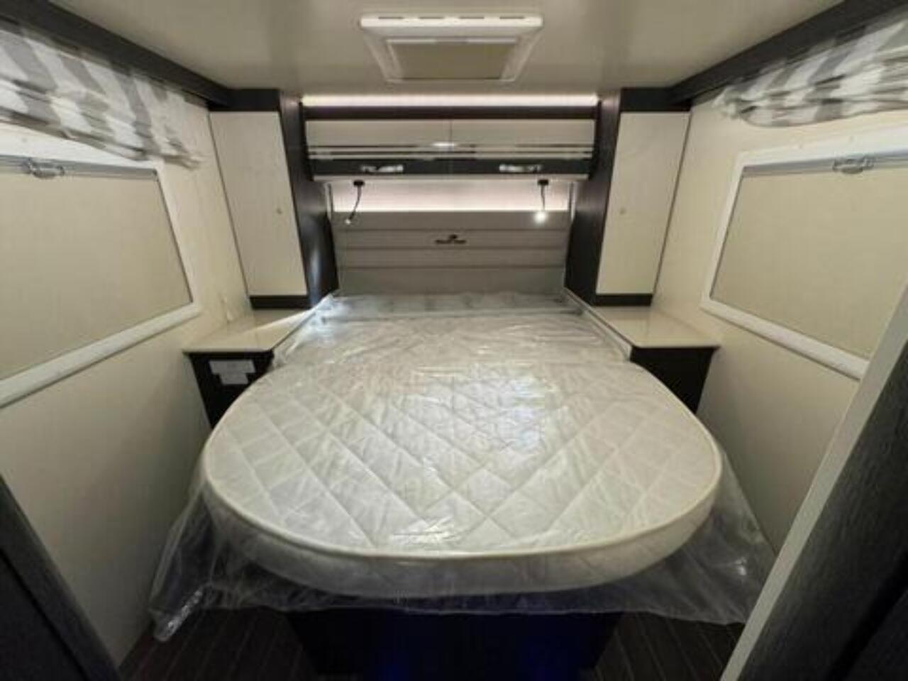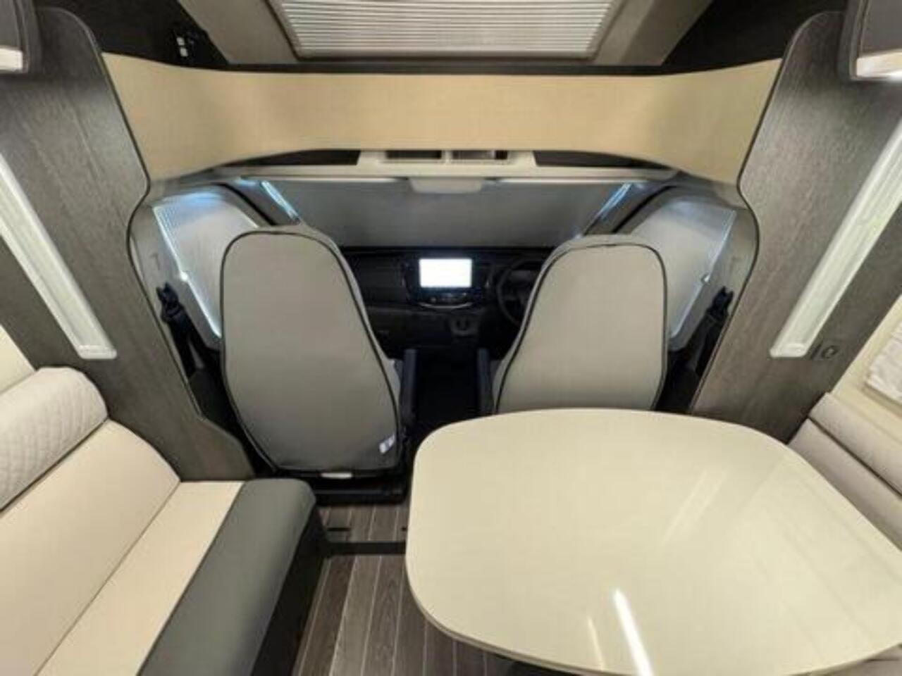 Get the five-star hotel feeling in the Zefiro 696. A rear island bed with under bed storage, bedside tables and two wardrobes all closed off by sliding to door give a level of privacy and peacefulness usually only ever dreamed of when away in a hotel. Just in front of this, you’ll discover the domestic style shower cubicle separate from the remainder of the bathroom. The popular L-shaped lounge area, dressed in fine Caterina soft furnishings, creates seating for up to five people during the day, offering a homely space for relaxing and entertaining. Come night-time, a second double bed from the delicate body curves of the Zefiro 696 lowers down above the lounge using a smooth, electric mechanism. Fitted 200W Solar panel, Cab air conditioning, Cruise control with speed limiter function, Radio with steering wheel controls and Bluetooth connectivity, Passenger airbag, Electrically operated and heated mirrors, 6KW Combined + electric / gas heating and hot water. Ford Transit 165 BHP as Standard, 4 Berth, 4 Belts Rear Double Bed & Electric Drop Down Bed Flexi Space - Included in Price Max Gross Weight - 3500 kg Mass In Running Order- 3145 kg Towable Weight - 1500 kg External Length - 7450 mm External Width - 2350 mm External and Internal Height (MM) - Automatic gearbox, alloy wheels, flex-space bed, 5th seatbelt in dinette fitted as an extra. Lights with USB plugs in the bedroom (standard) New Truma control & APP for on-board systems, incl. heating (standard) 220 V socket inside the garage (standard)