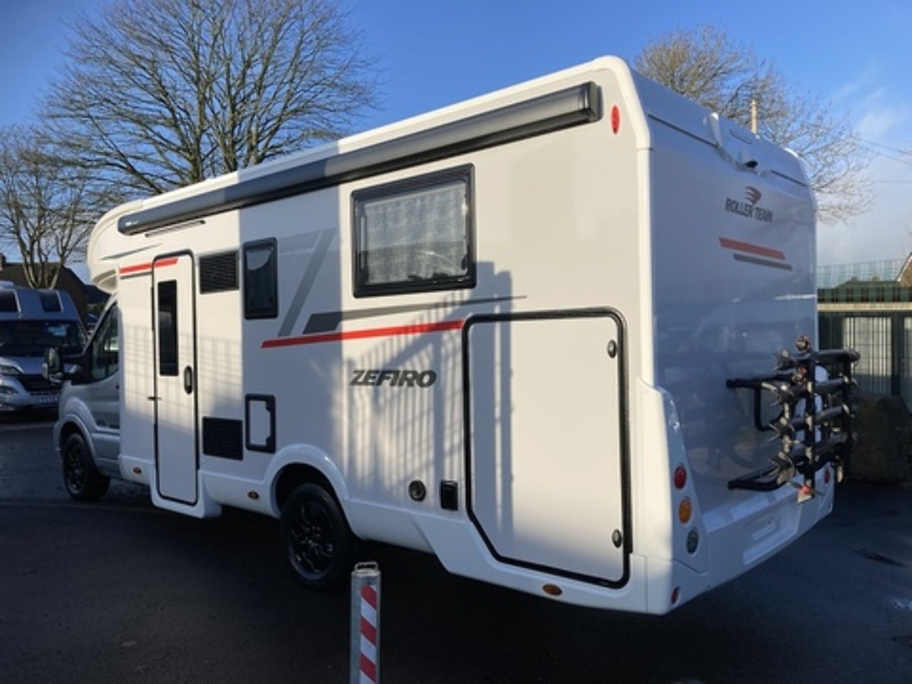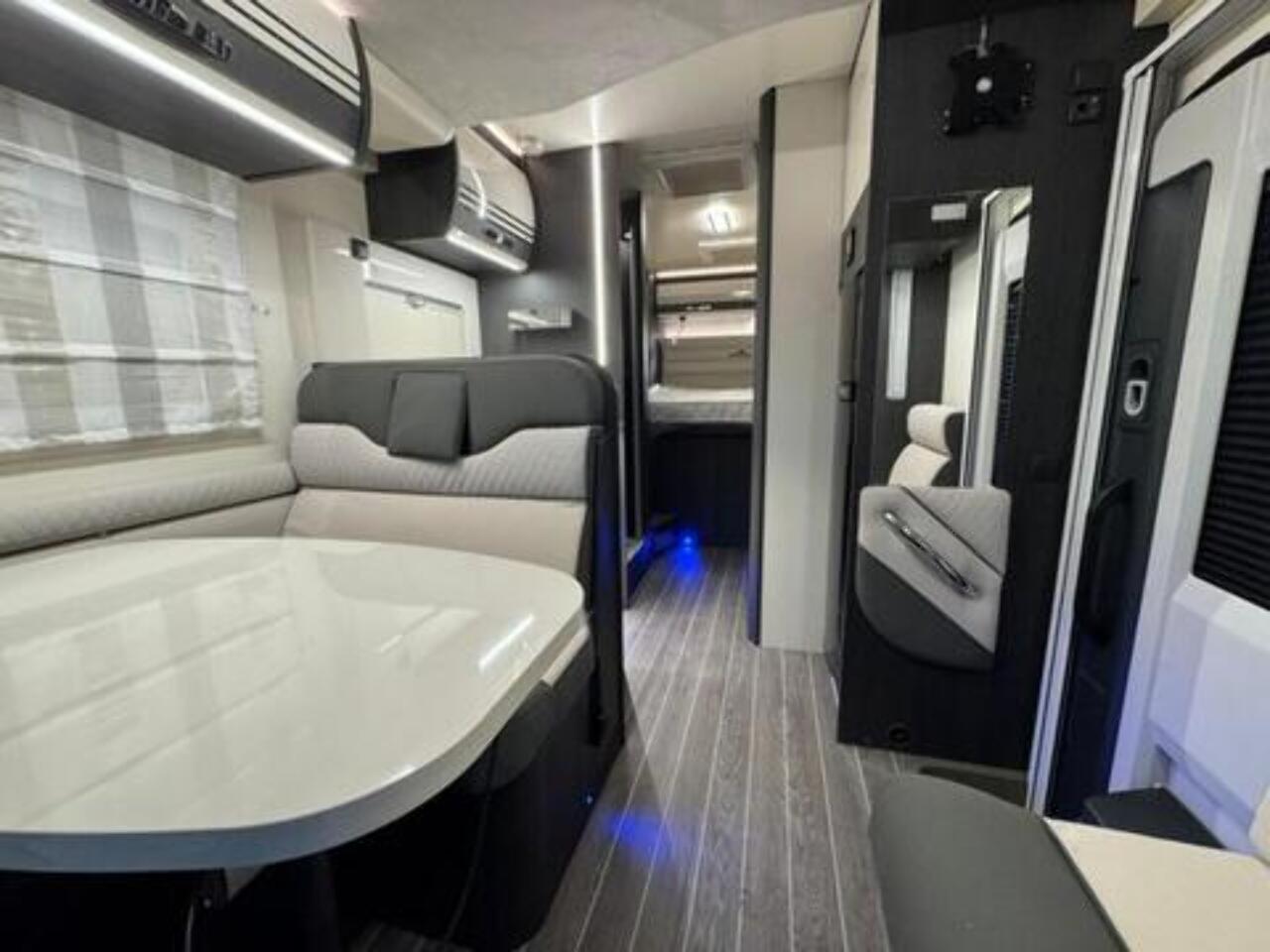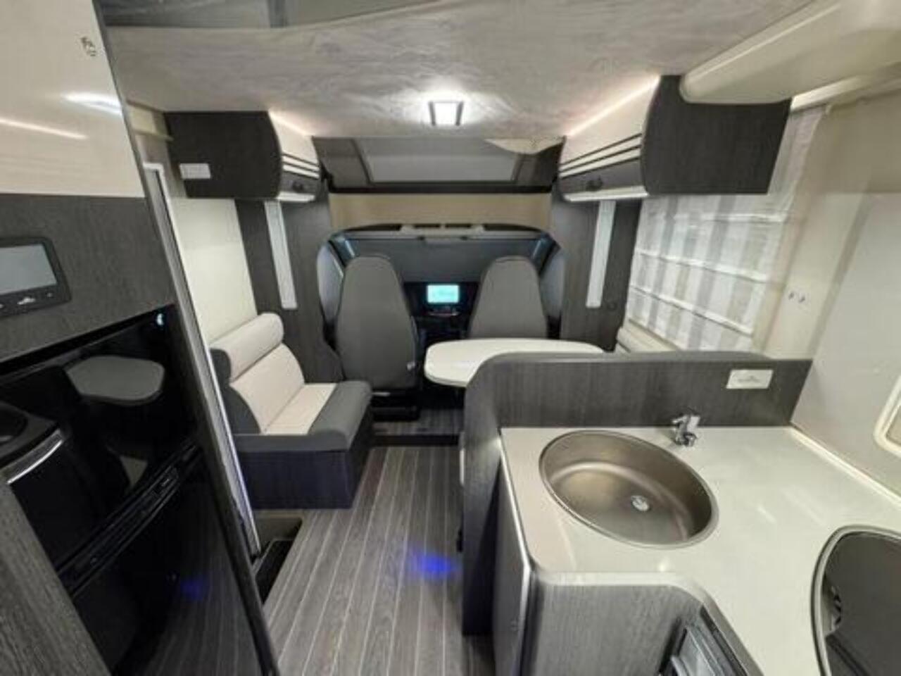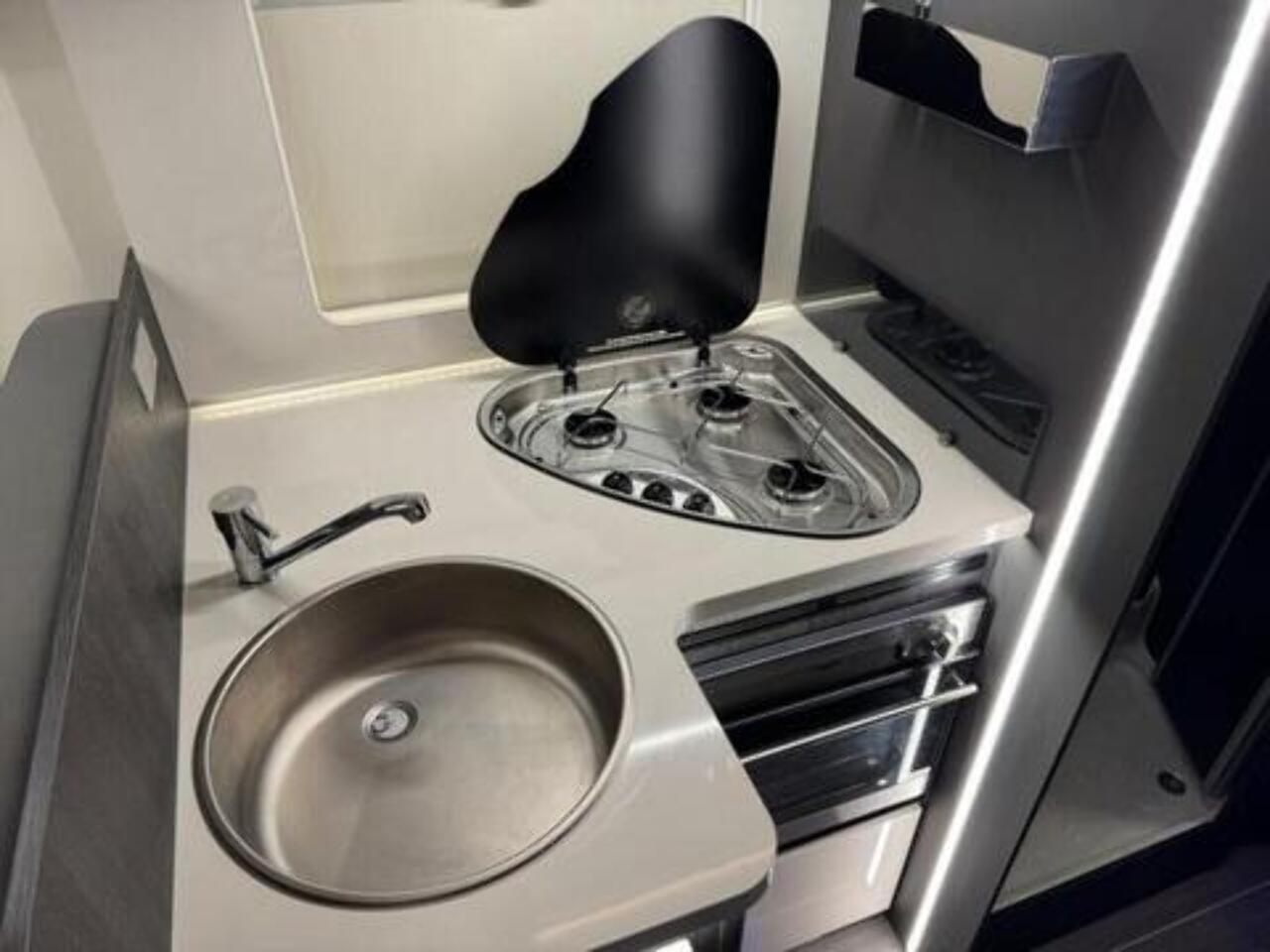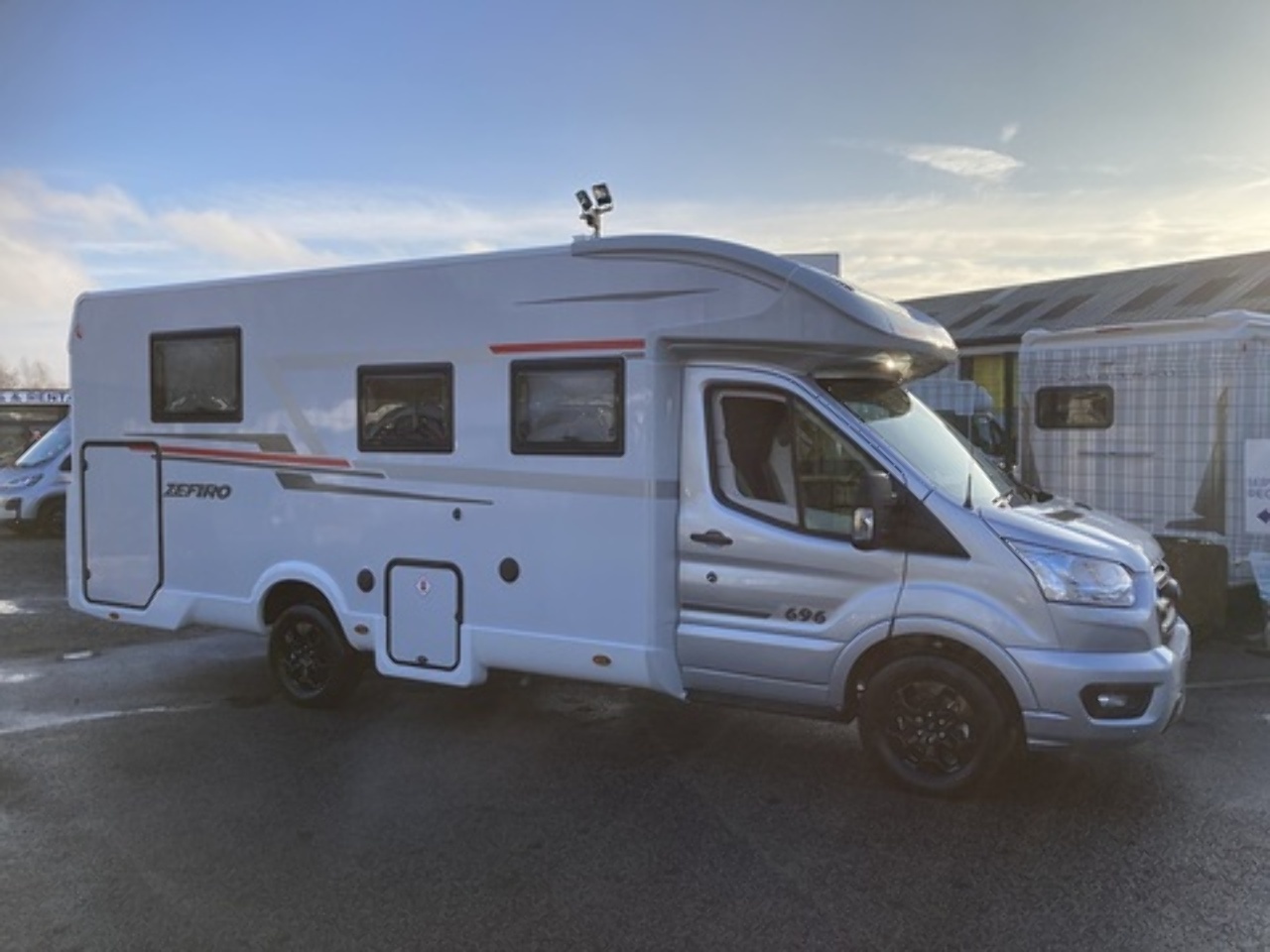 Get the five-star hotel feeling in the Zefiro 696. A rear island bed with under bed storage, bedside tables and two wardrobes all closed off by sliding to door give a level of privacy and peacefulness usually only ever dreamed of when away in a hotel. Just in front of this, you’ll discover the domestic style shower cubicle separate from the remainder of the bathroom. The popular L-shaped lounge area, dressed in fine Caterina soft furnishings, creates seating for up to five people during the day, offering a homely space for relaxing and entertaining. Come night-time, a second double bed from the delicate body curves of the Zefiro 696 lowers down above the lounge using a smooth, electric mechanism. Fitted 200W Solar panel, Cab air conditioning, Cruise control with speed limiter function, Radio with steering wheel controls and Bluetooth connectivity, Passenger airbag, Electrically operated and heated mirrors, 6KW Combined + electric / gas heating and hot water. Ford Transit 165 BHP as Standard, 4 Berth, 4 Belts Rear Double Bed & Electric Drop Down Bed Flexi Space - Included in Price Max Gross Weight - 3500 kg Mass In Running Order- 3145 kg Towable Weight - 1500 kg External Length - 7450 mm External Width - 2350 mm External and Internal Height (MM) - Automatic gearbox, alloy wheels, flex-space bed, 5th seatbelt in dinette fitted as an extra. Lights with USB plugs in the bedroom (standard) New Truma control & APP for on-board systems, incl. heating (standard) 220 V socket inside the garage (standard)