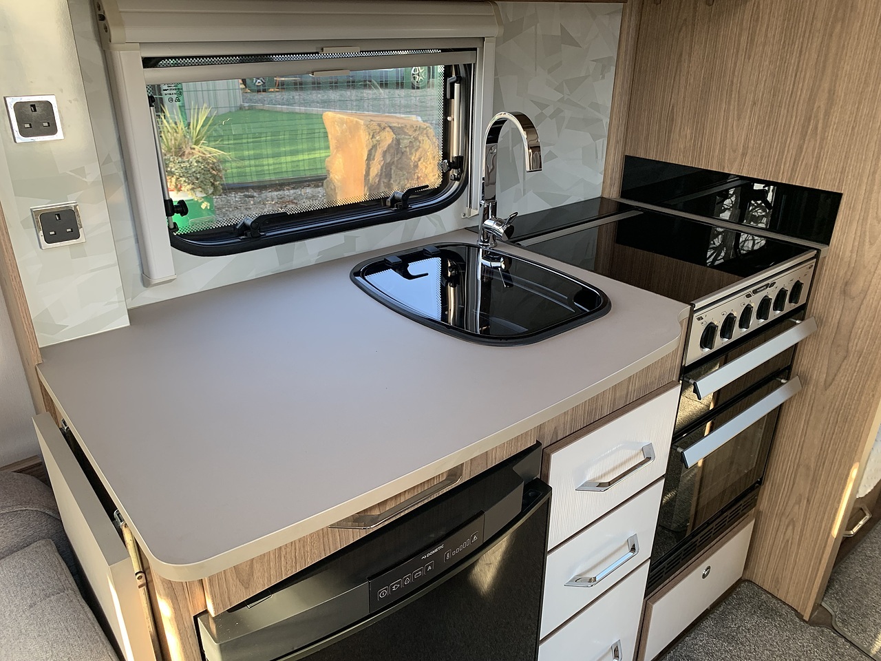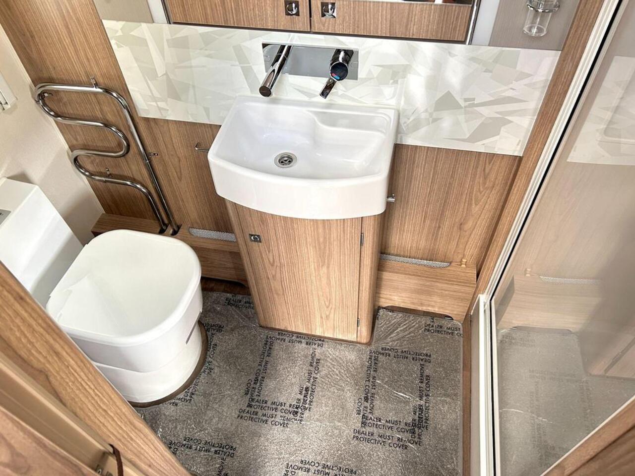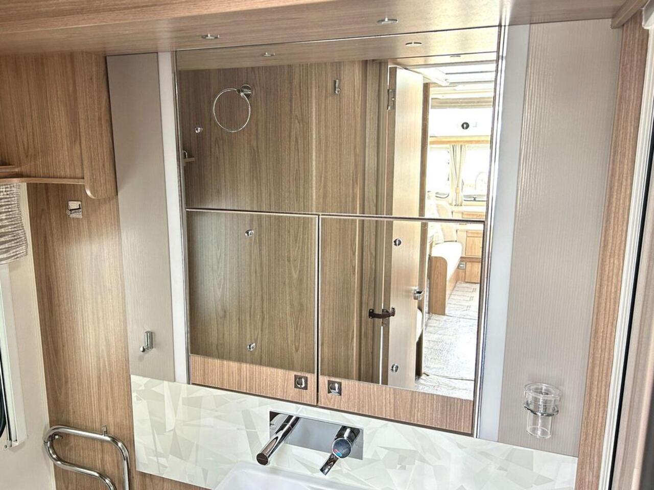 Internal premium upholstery in a neutral modern and high quality finish. Rear washroom is generous in size featuring a separate shower cubicle, cassette toilet, sink large overhead mirrored cabinet with plenty of storage for toiletries