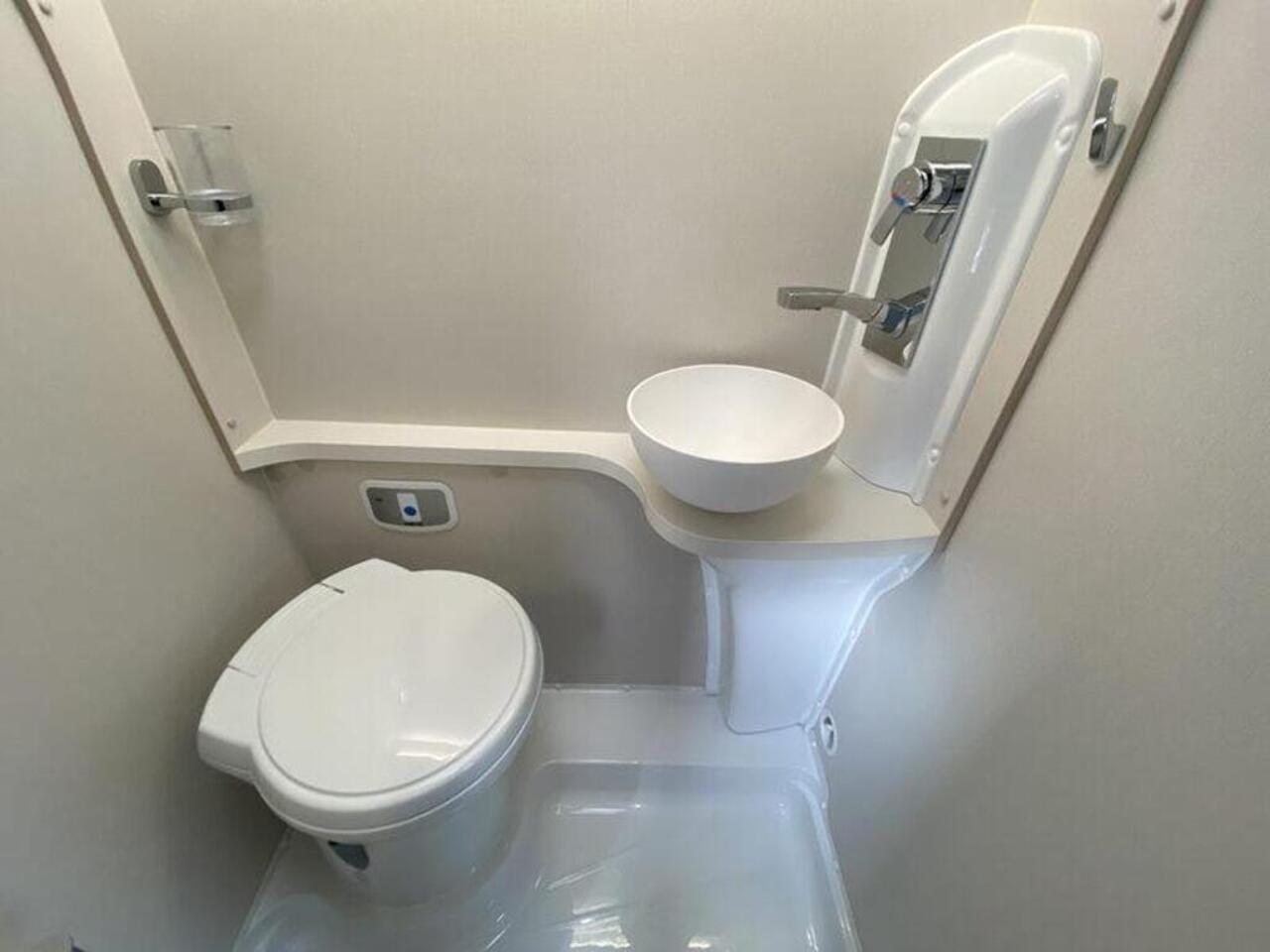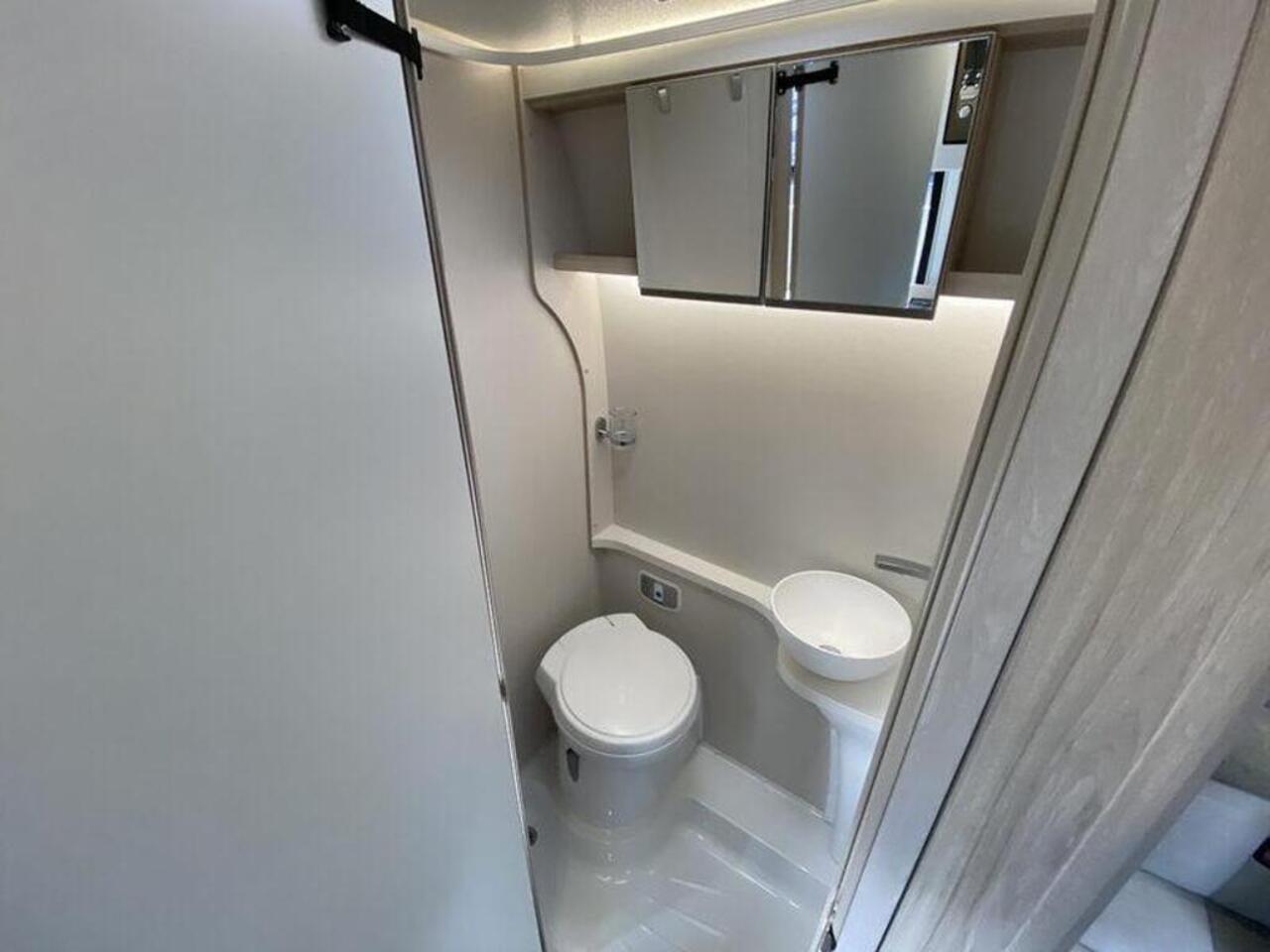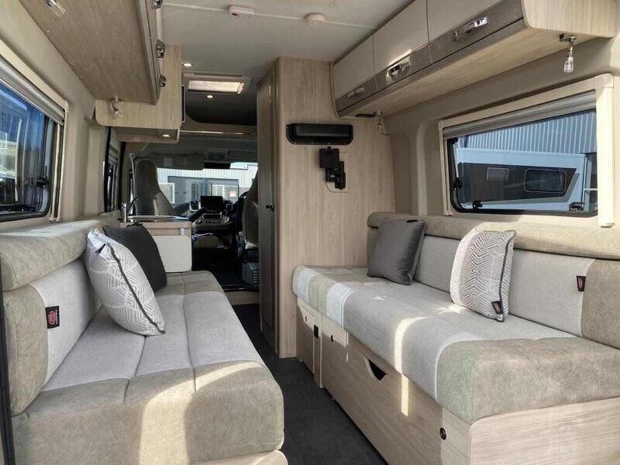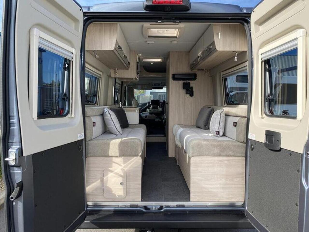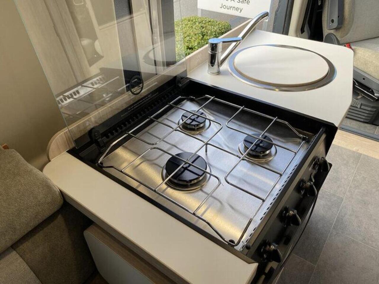 The interior features a contemporary design. The rear seating makes into a comfortable double bed, providing a spacious and uncluttered living area by day. The kitchen is well appointed, with a combi oven, a gas hob with a glass lid that provides extra work surface, and a fridge with a freezer compartment. The washroom is equipped with a cassette toilet, a vanity sink, and shower facilities. This model also comes with a microwave and a useful awning for outdoor living.